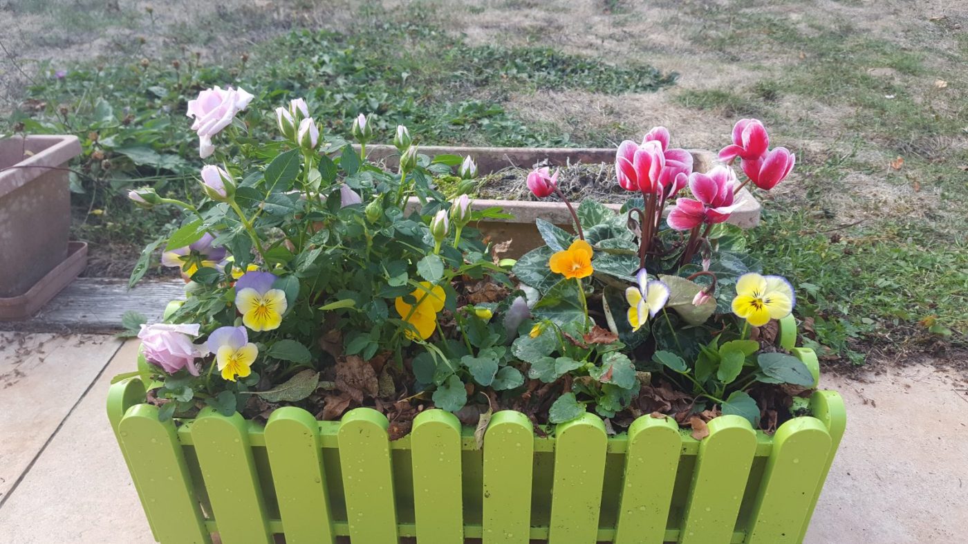Elle est composée de quatre pensées, un cyclamen et un rosier (une jolie petite folie qui n’est censée fleurir que jusqu’à octobre ! Han c’est déjà fini ? Mais non, il fait encore des fleurs, on verra comment ça se passe sur la durée. C’est ça aussi le jardinage : prendre des risques, tenter de nouvelles expériences… !).