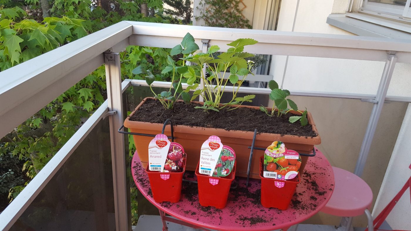 • Trois fraisiers de variétés différentes dont deux remontants (ce n’est pas qu’ils remontent quoi que ce soit, cela veut dire qu’ils donnent deux récoltes dans l’année !). Les deux remontants sont la variété « Anared » et « Reine des Vallées ». Le non-remontant est un fraisier « Maras des bois » (très bonne variété).