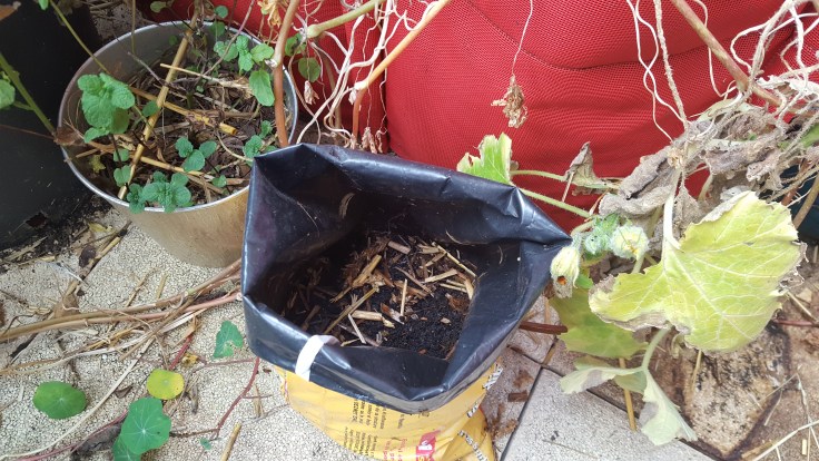 C’est l’automne et presque toutes mes copines ont fané, c’est le temps de la récolte. J’ai fait de même il y a peu de temps et la jardinière m’a récoltée après tout ce temps dans mon sac de terreau. Elle a également pris soin de laisser une de mes petites descendantes dans la terre.