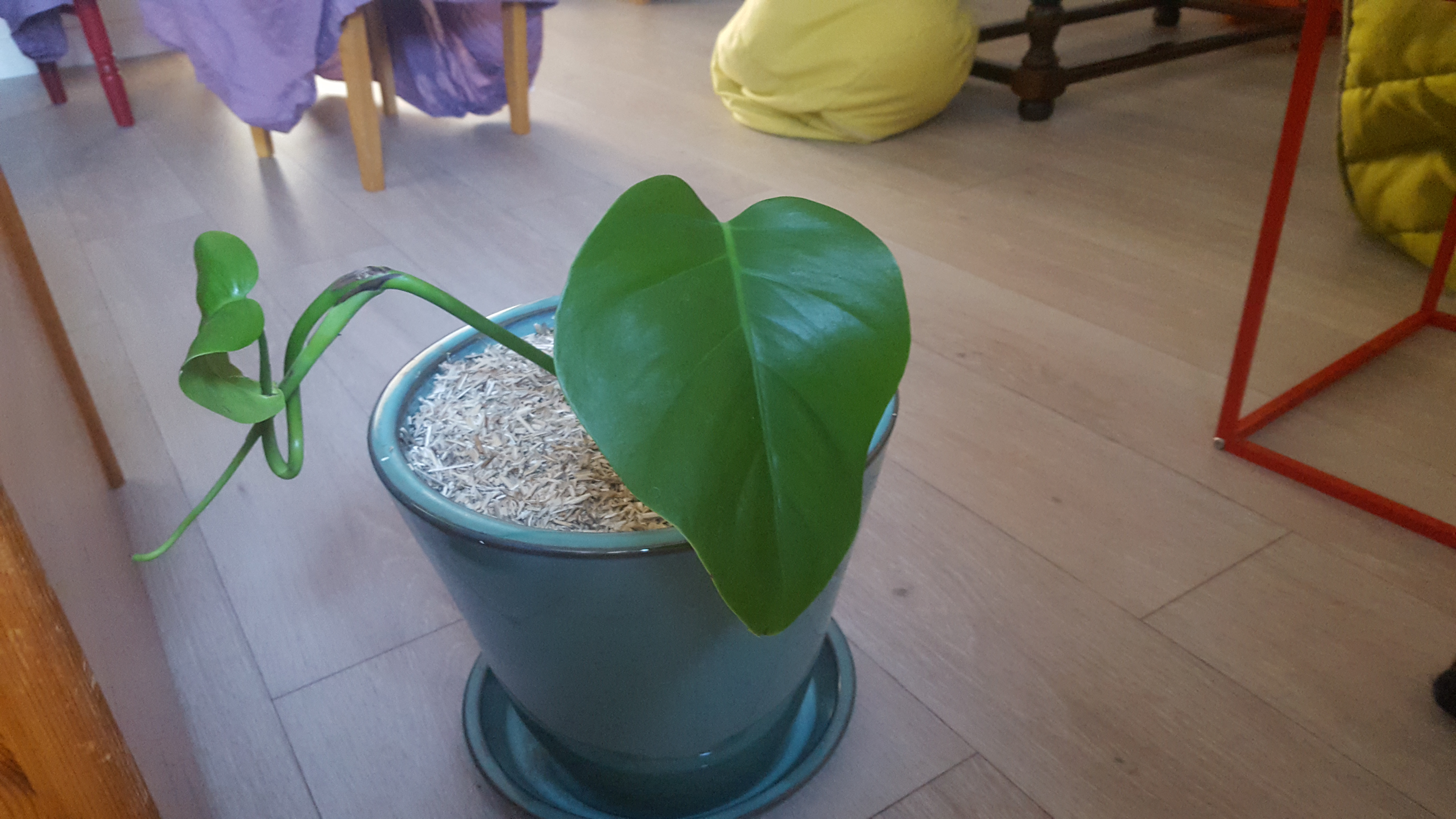 S’il faut s’en occuper en armure, ça ne me dit trop rien une Monstera. Pourtant, elle a l’air bien pacifique dans son joli pot bleu.