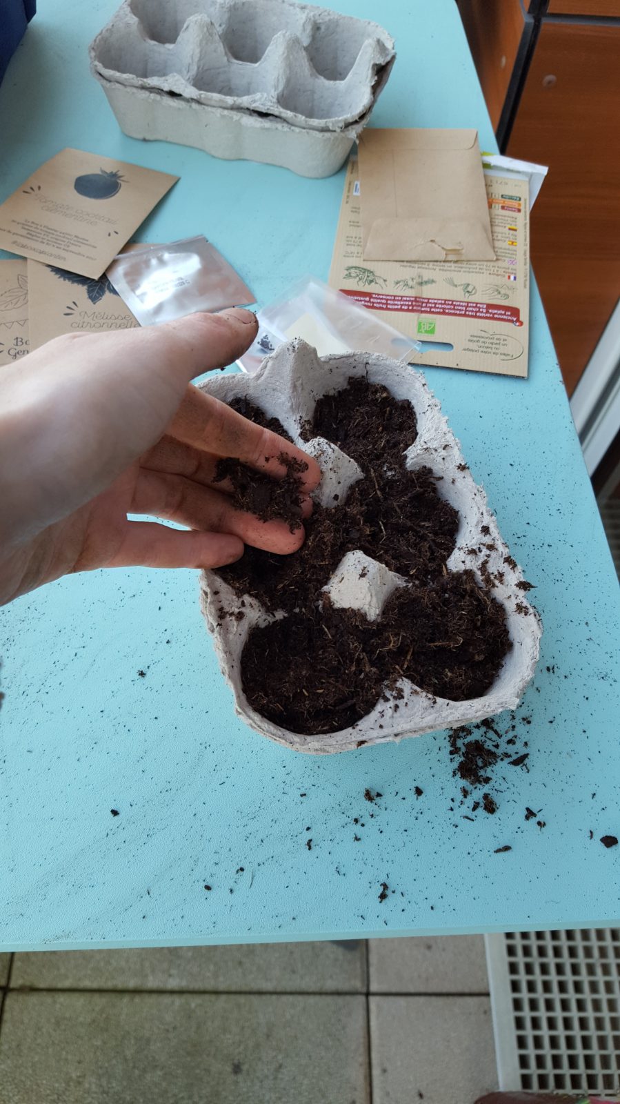 - Remplissez votre contenant (ici une boîte à œufs) avec du terreau.