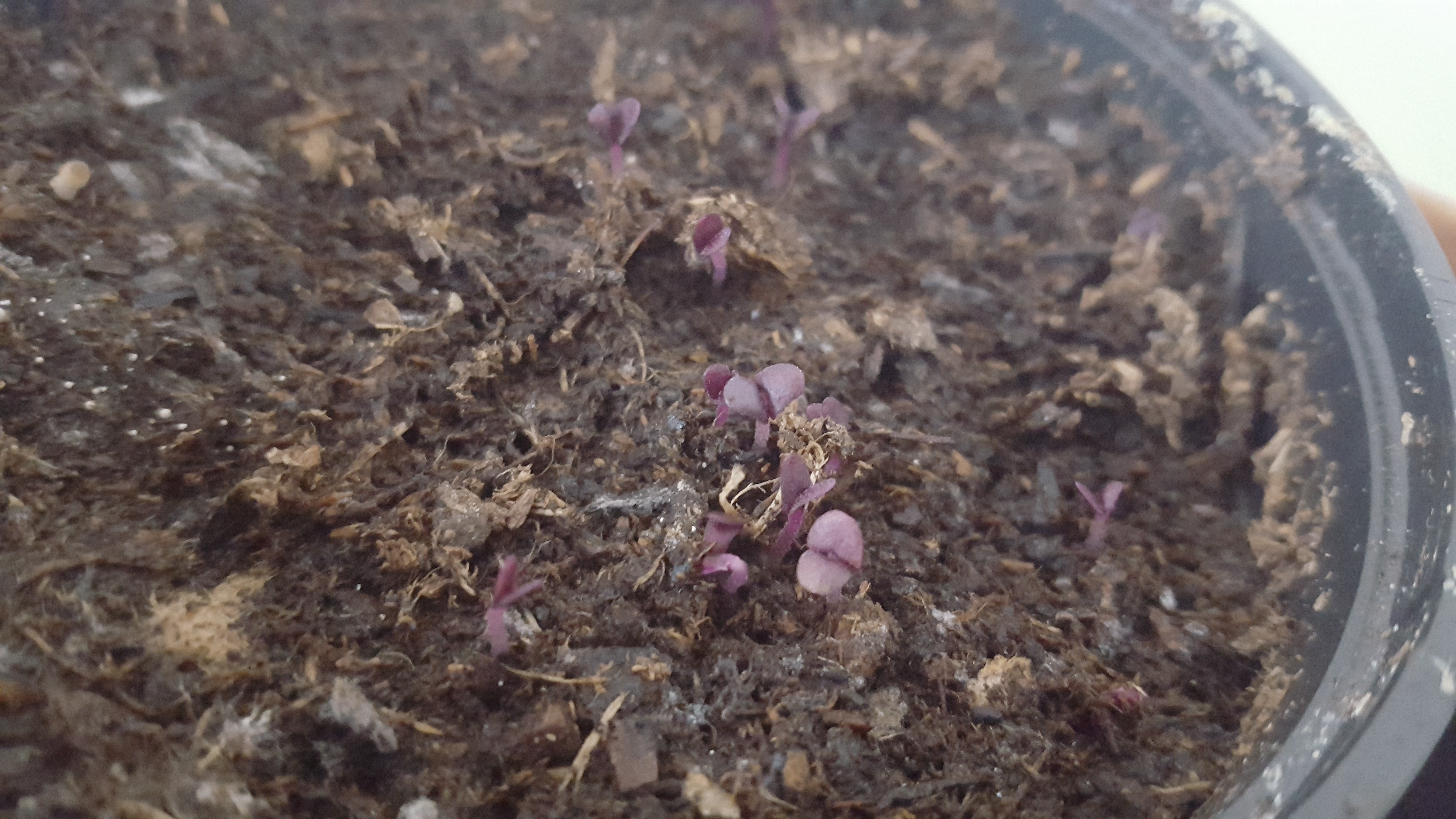 - Le basilic a été semé le 23 février et les voilà qui sortent déjà de terre ! Plus qu’à esquiver la fonte des semis en évitant de garder le terreau trop humide et en aérant.