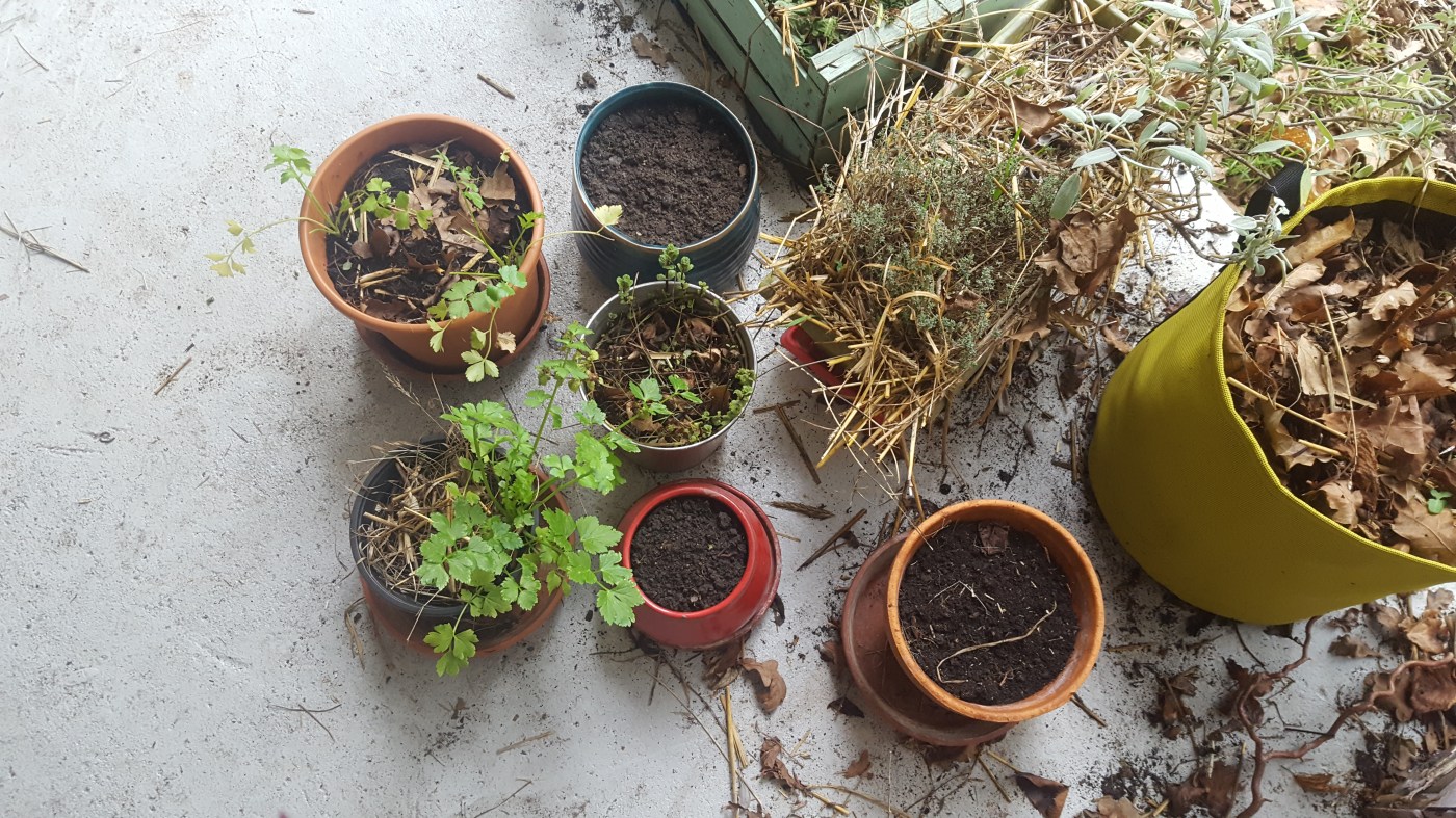 - Nettoyez vos jardinières et pots en enlevant les herbes et les plantes sèches (que je laisse en hiver pour permettre aux insectes de se cacher !) et en remettant de la terre. Comme ça tout est prêt pour les semis (d’engrais verts ou de plantes à semer en extérieur !) et par la suite pour accueillir mes gentils plants qui vont pousser tranquillou au chaud en mars (dans mon bureau-serre).