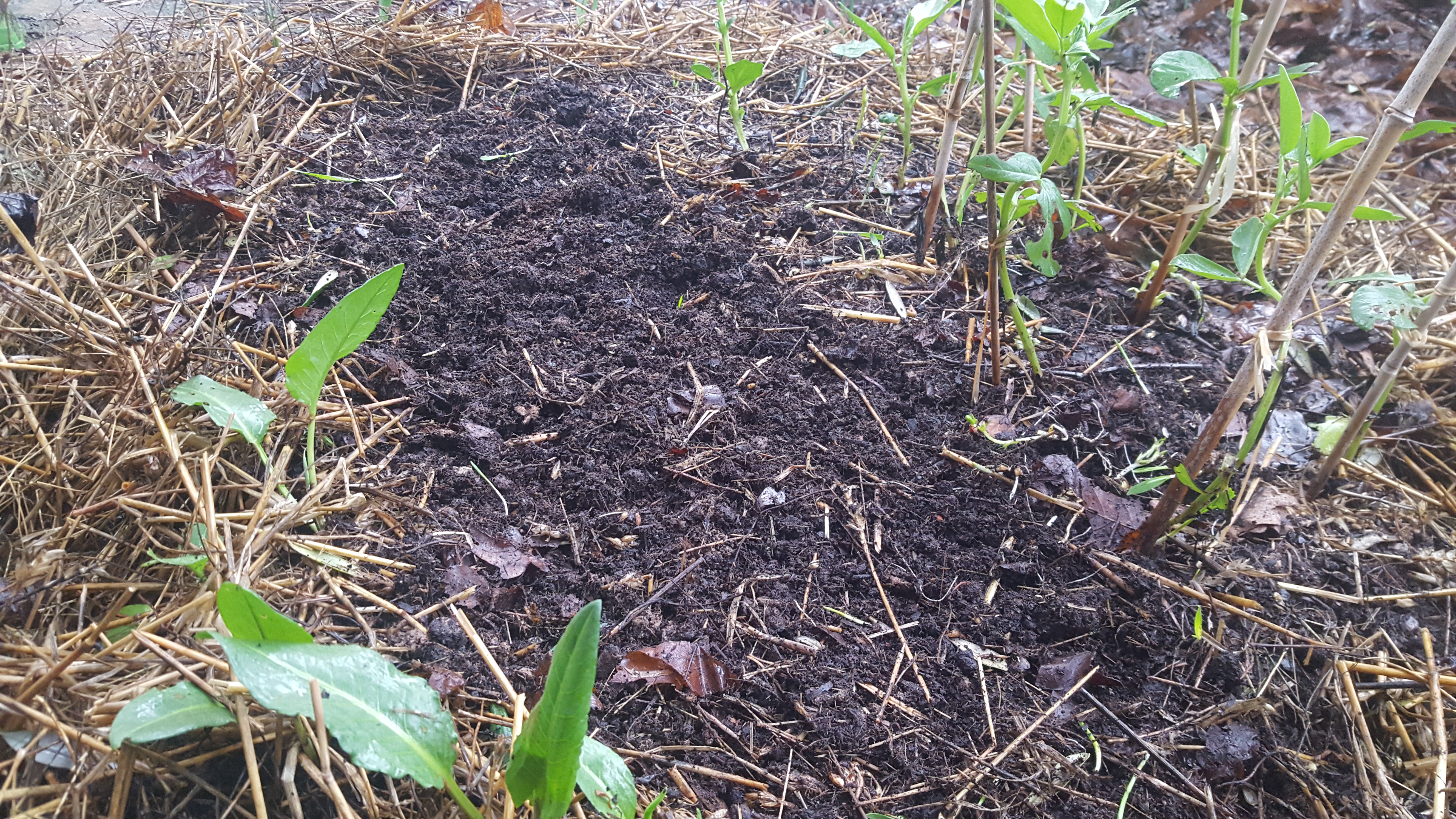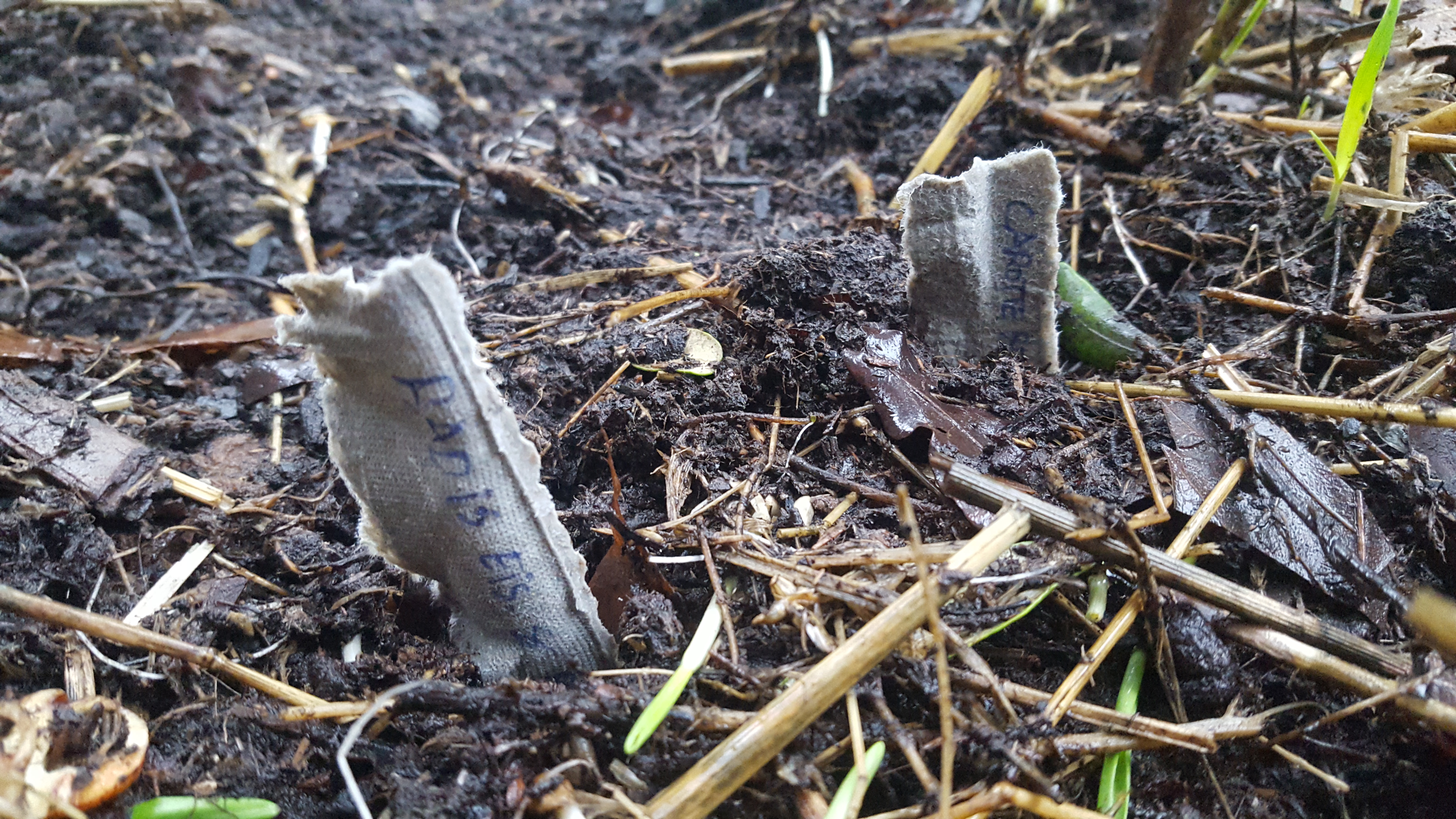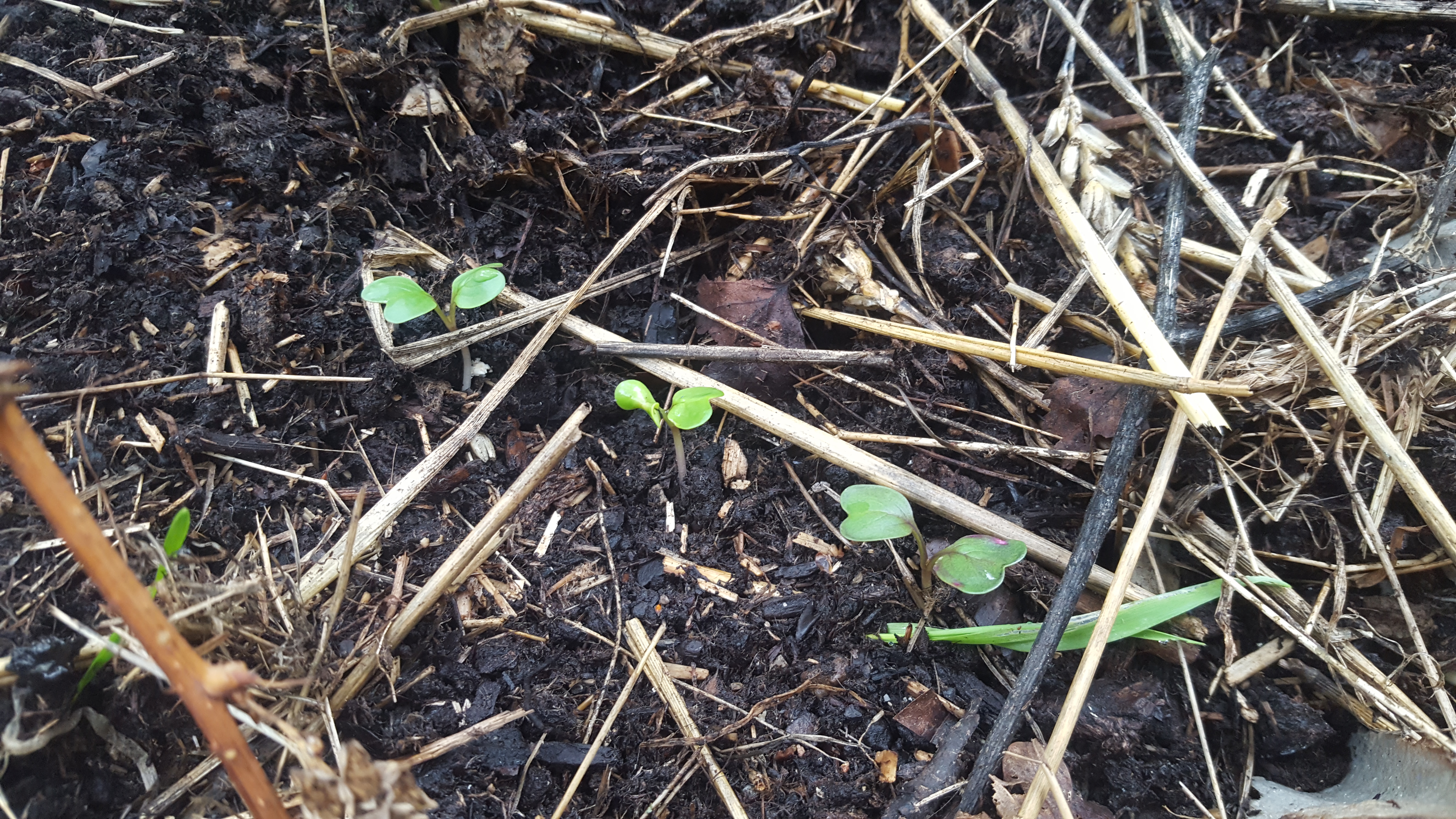 - J’ai semé des radis, des tipois et des carottes bien en ligne. Mais voilà, c’était sans compter sur l’appétit vorace des merles qui viennent retourner la terre de ma lasagne ! Depuis je boude. Non j’ai mis des branches de framboisier pour les dissuader quelque peu. Et hourrah, je crois que ça marche (gné plus qu’à recommencer mes semis maintenant !). Certaines graines de radis ont levé malgré ce labourage intempestif !