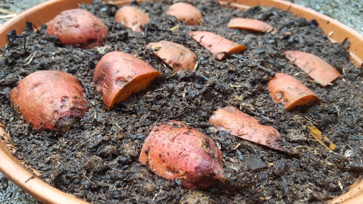 - Des patates douces : j’ai fait comme je le préconisais dans mon article sur les objectifs de février mais, prudence, je ne suis pas sûre que cela fonctionne (certains bouts moisissent…!). Affaire à suivre.