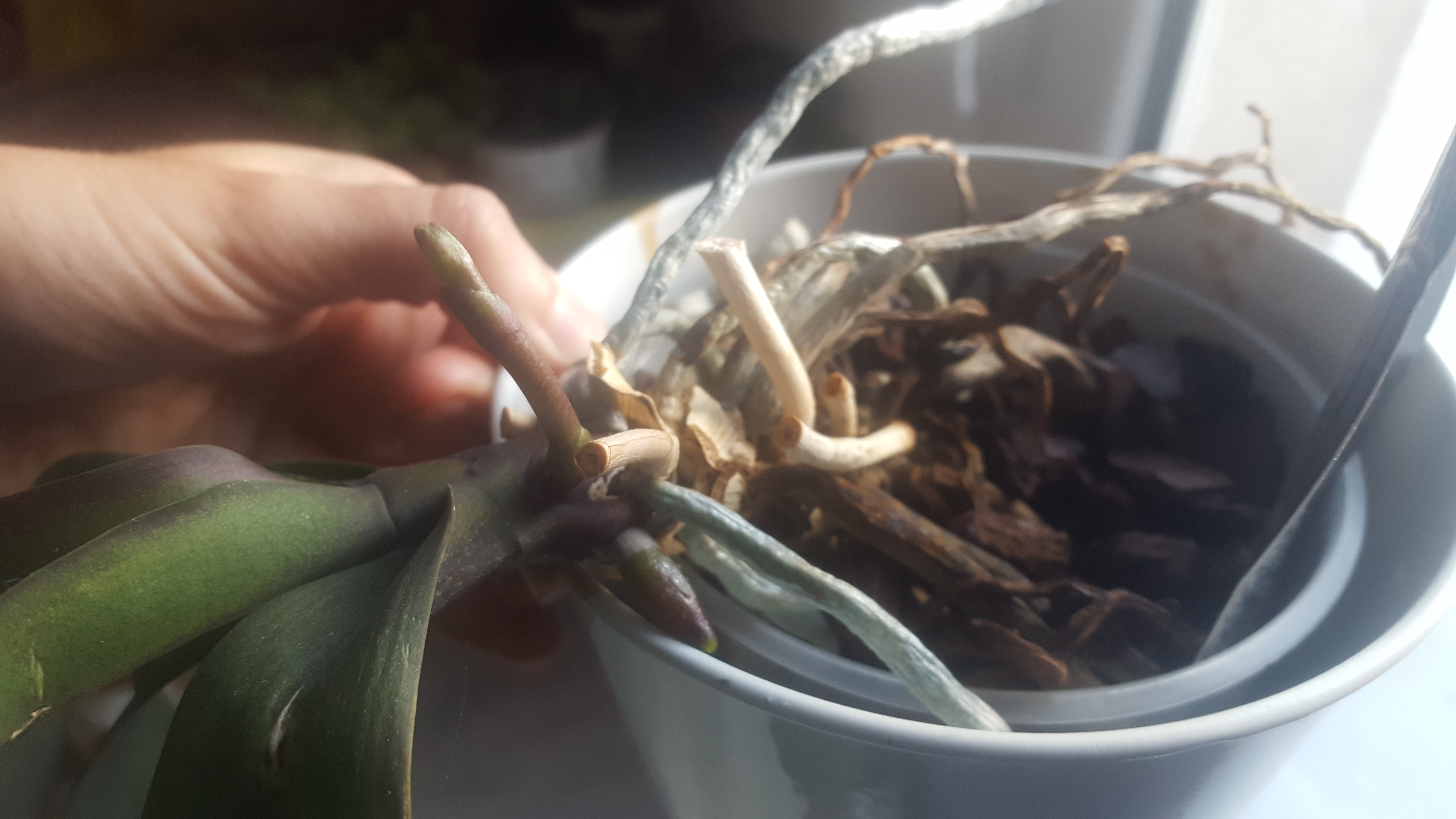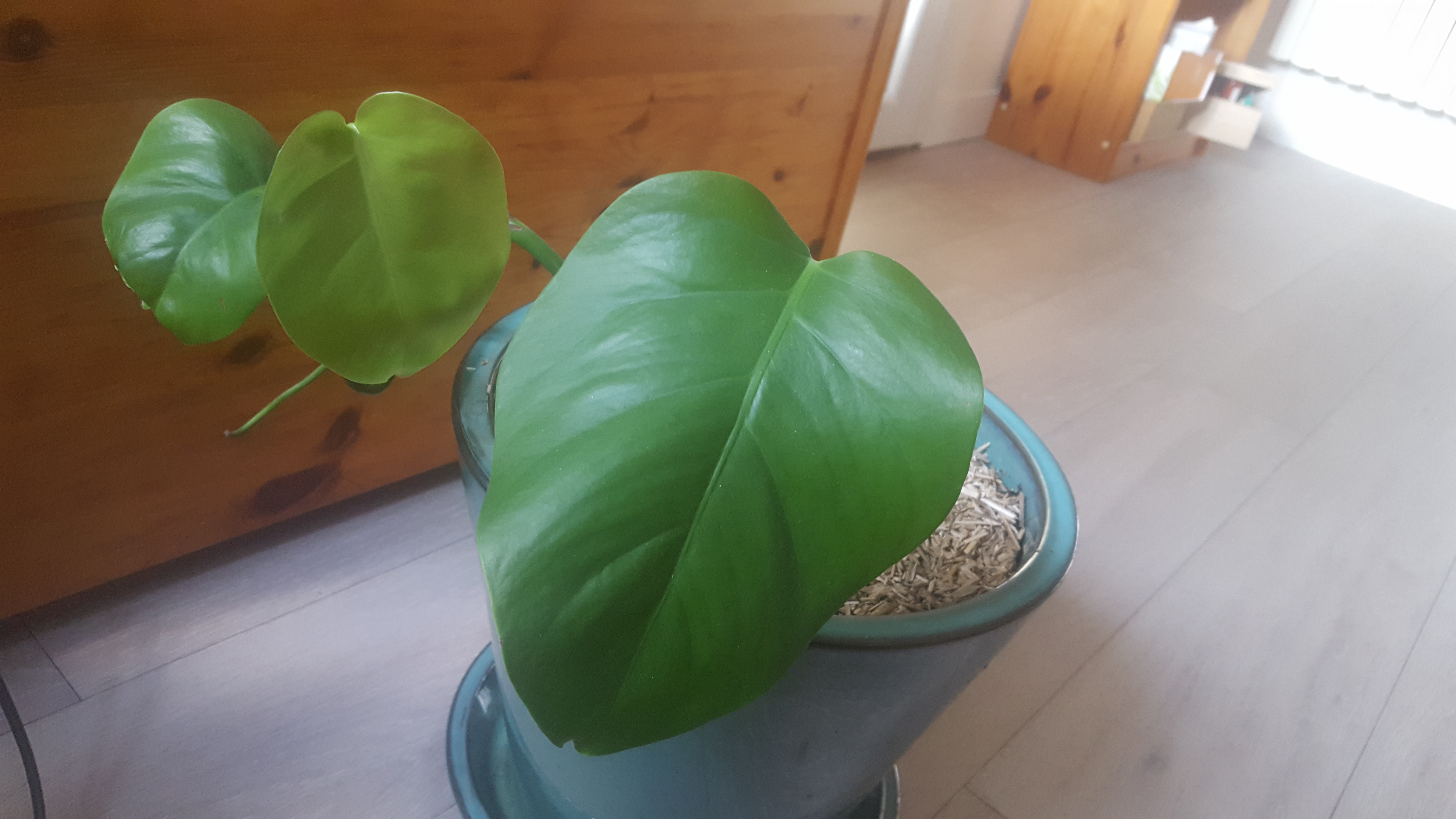 - La monstera qui a végété dans son pot depuis son rempotage en janvier ! Elle commence tout juste à faire une nouvelle pousse ! Elle est partie ça y est ! On va tous mourir !