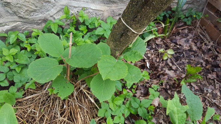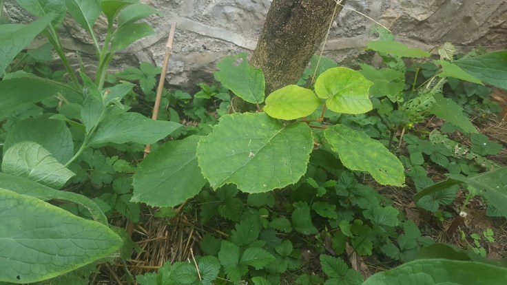 Kiwi le 30 mai : la partie de droite s’est fait manger et les feuilles jaunissent… Pourquoi ?! Je l’ai paillé avec de la consoude.