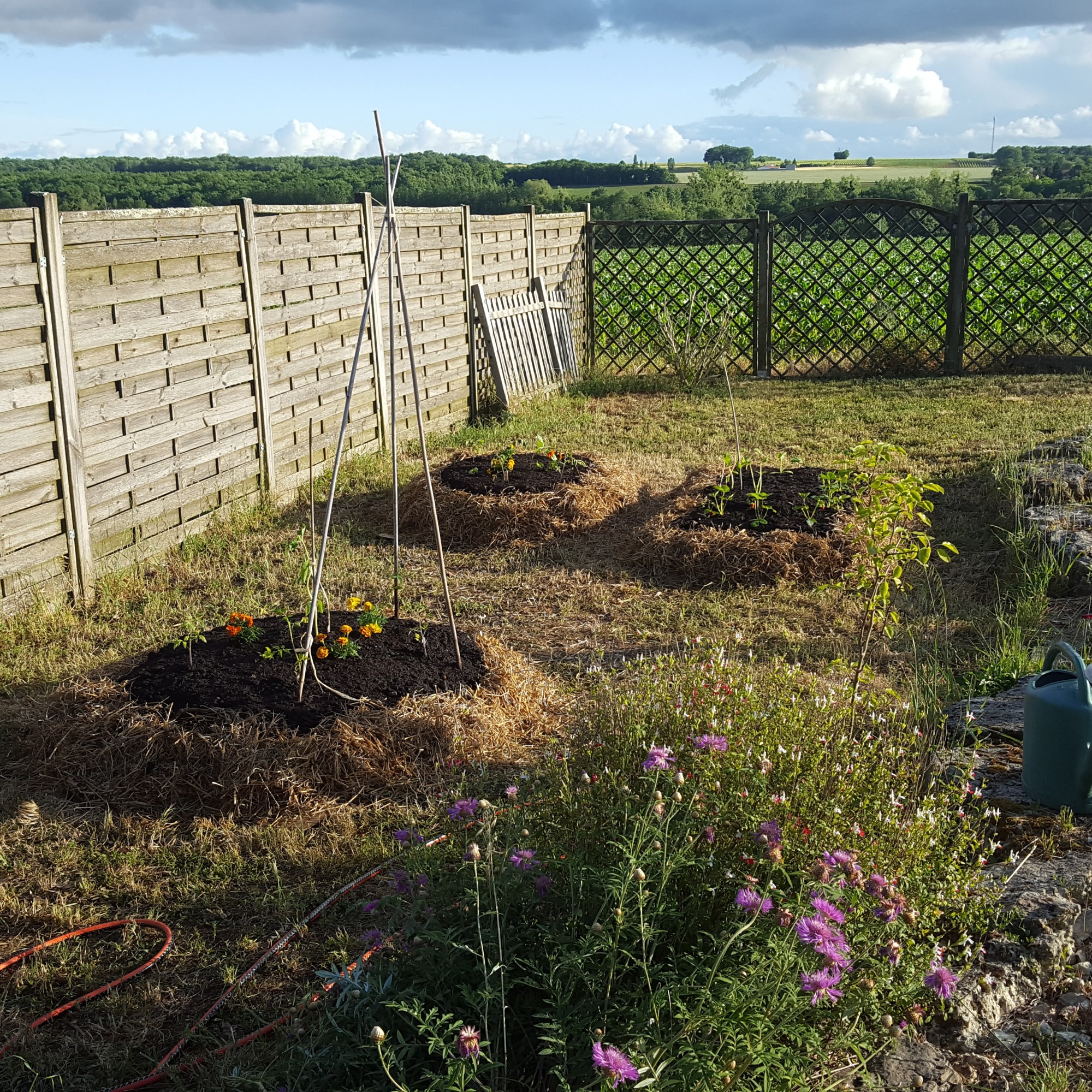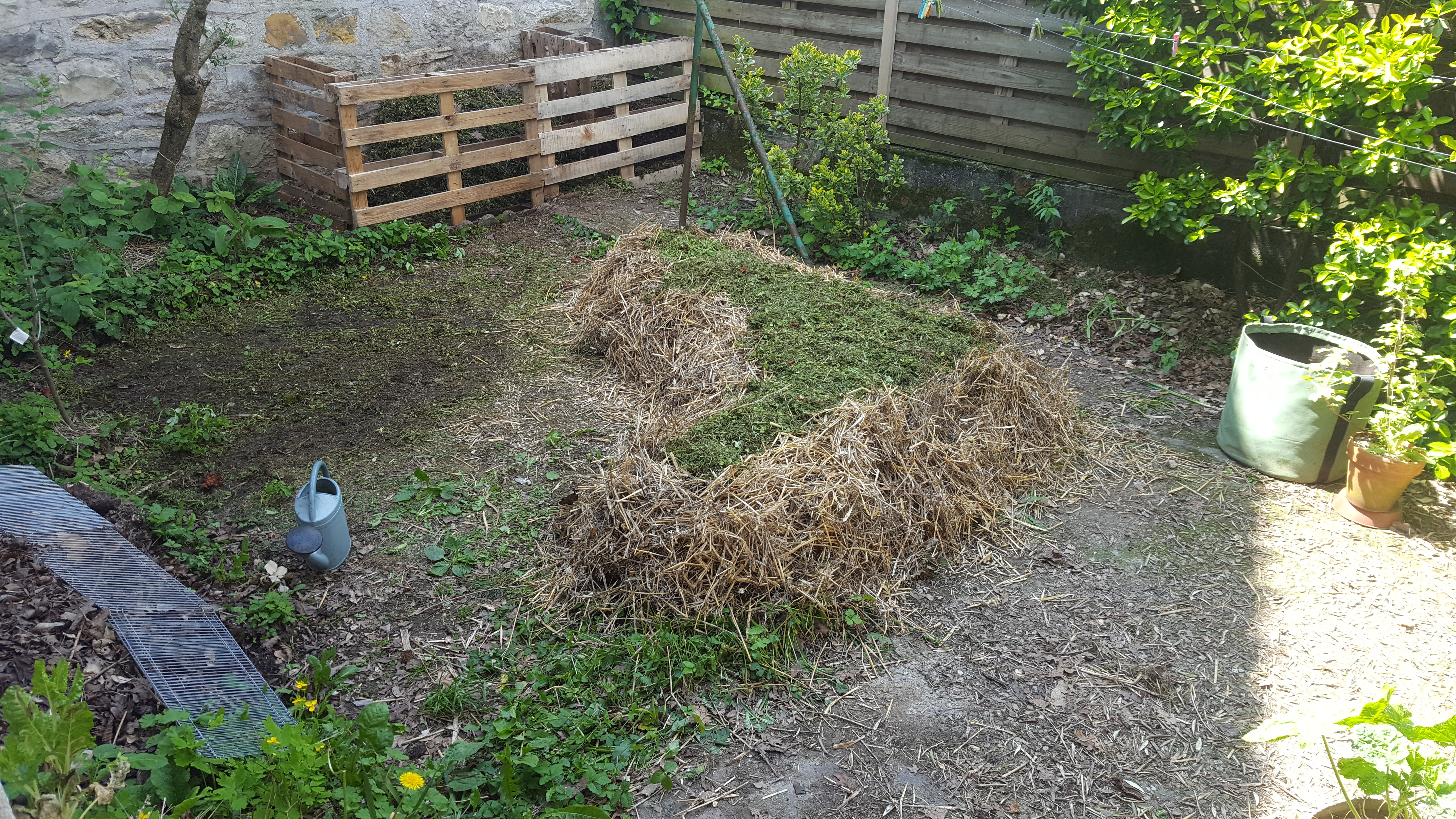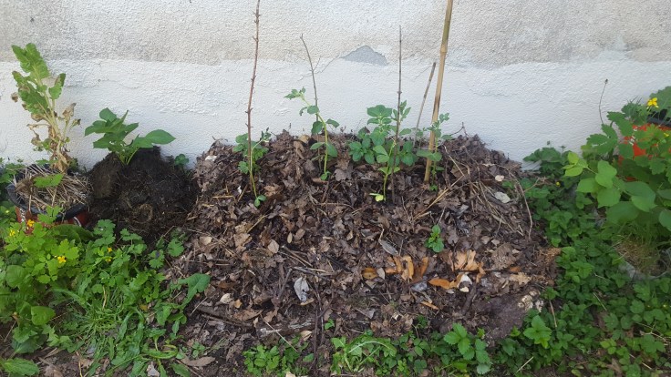 • Le buttage de mes pommes de terre : comme un gros bourrin, j’ai versé le paillage sur mes jeunes pousses vigoureuses de patates mais j’en ai cassé une… Les autres vont bien ! Je ferai doucement la prochaine fois.
