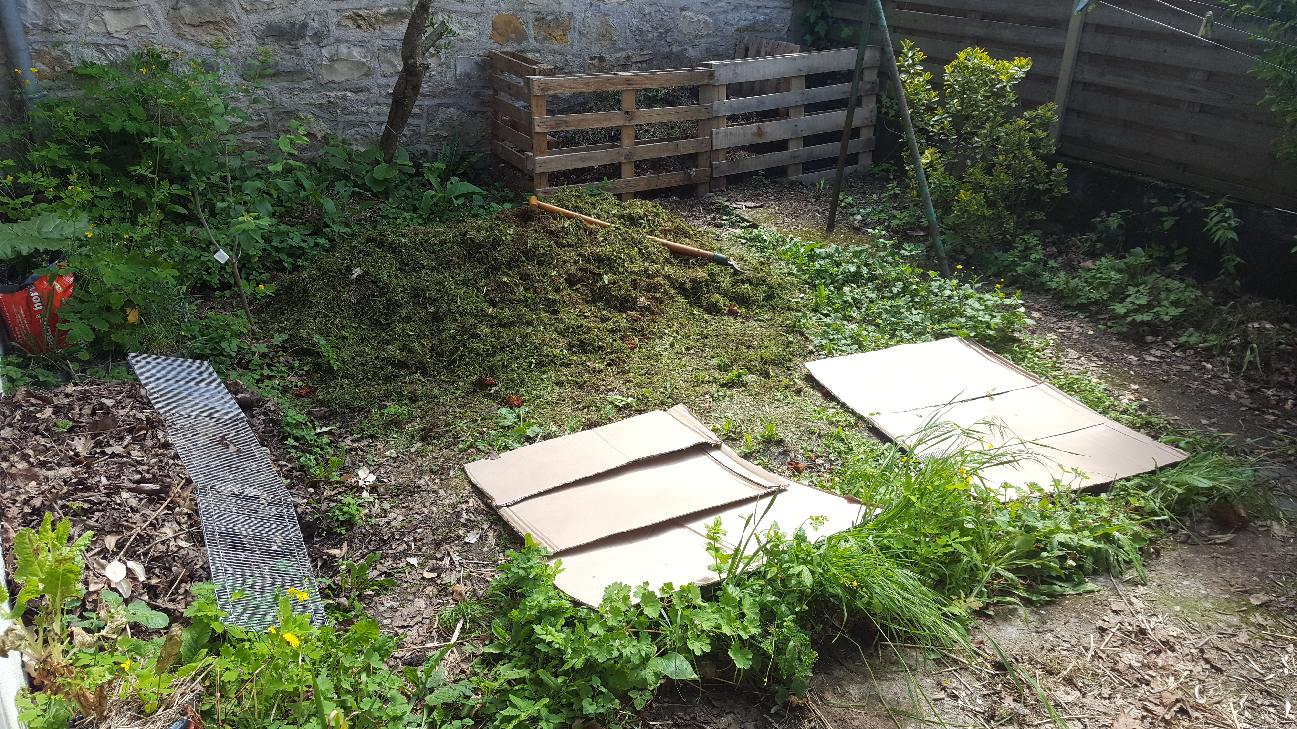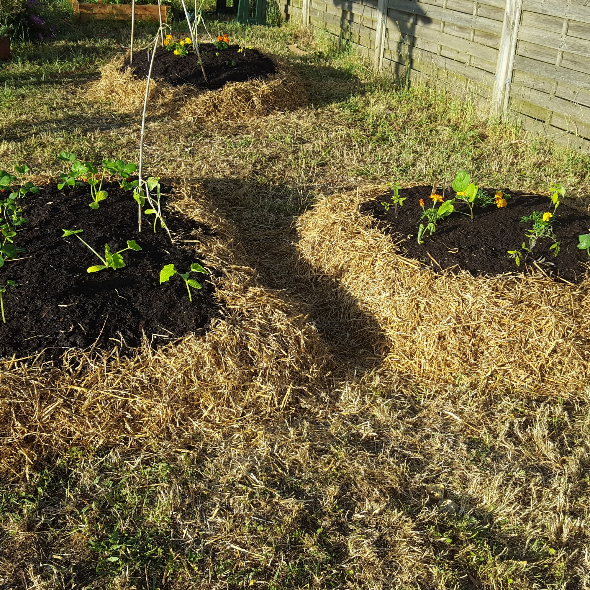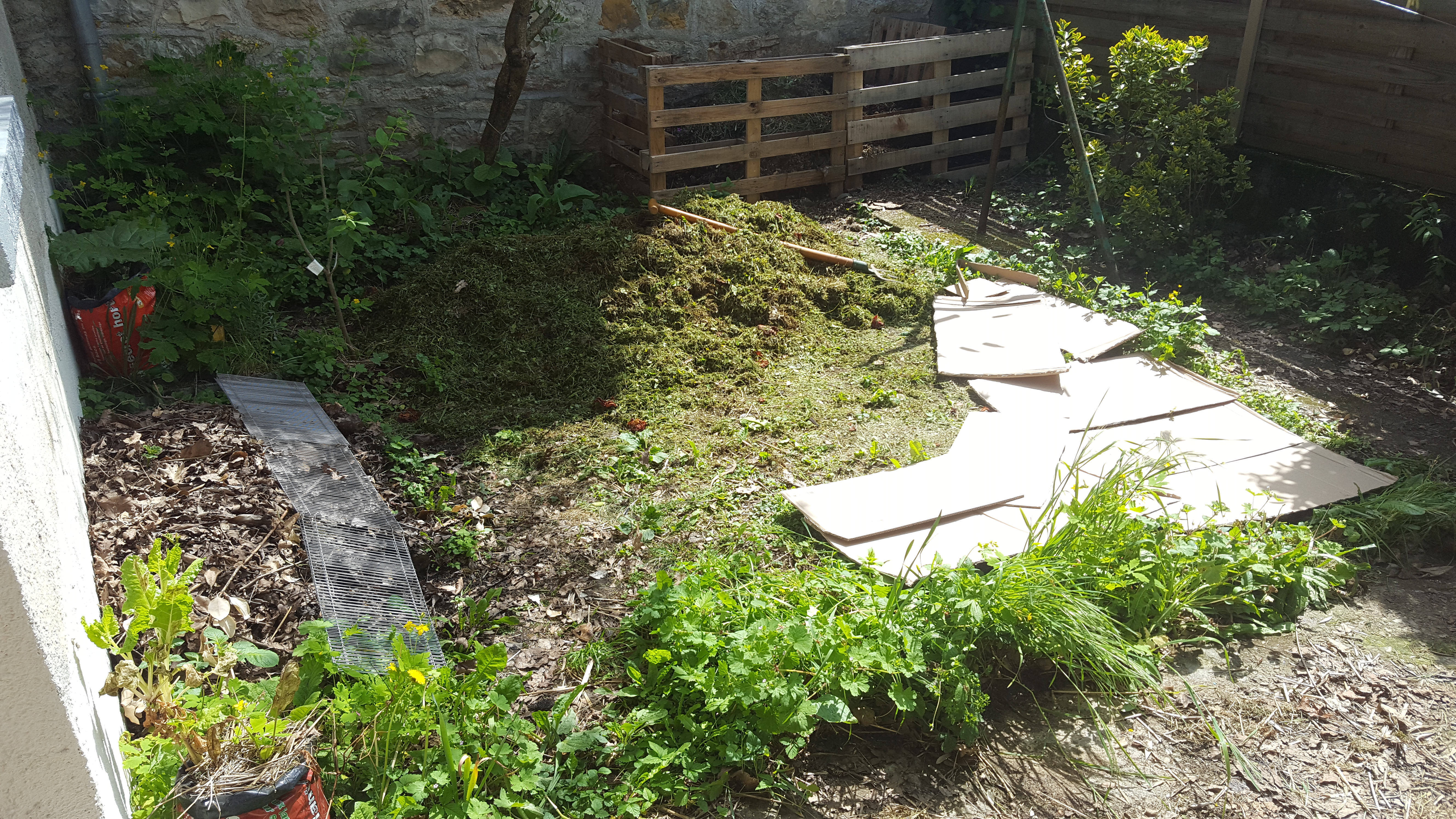 • Le buttage de mes pommes de terre : comme un gros bourrin, j’ai versé le paillage sur mes jeunes pousses vigoureuses de patates mais j’en ai cassé une… Les autres vont bien ! Je ferai doucement la prochaine fois.