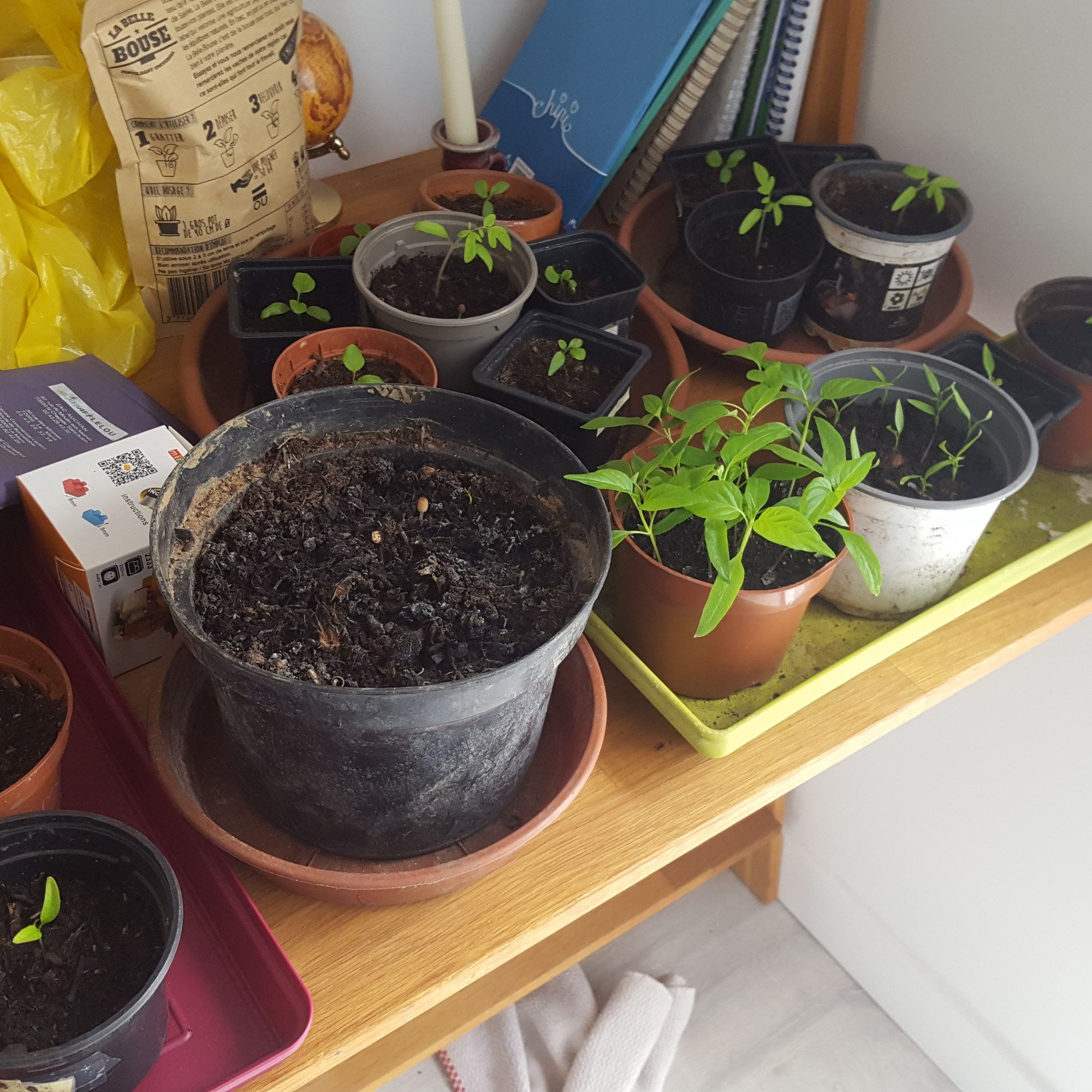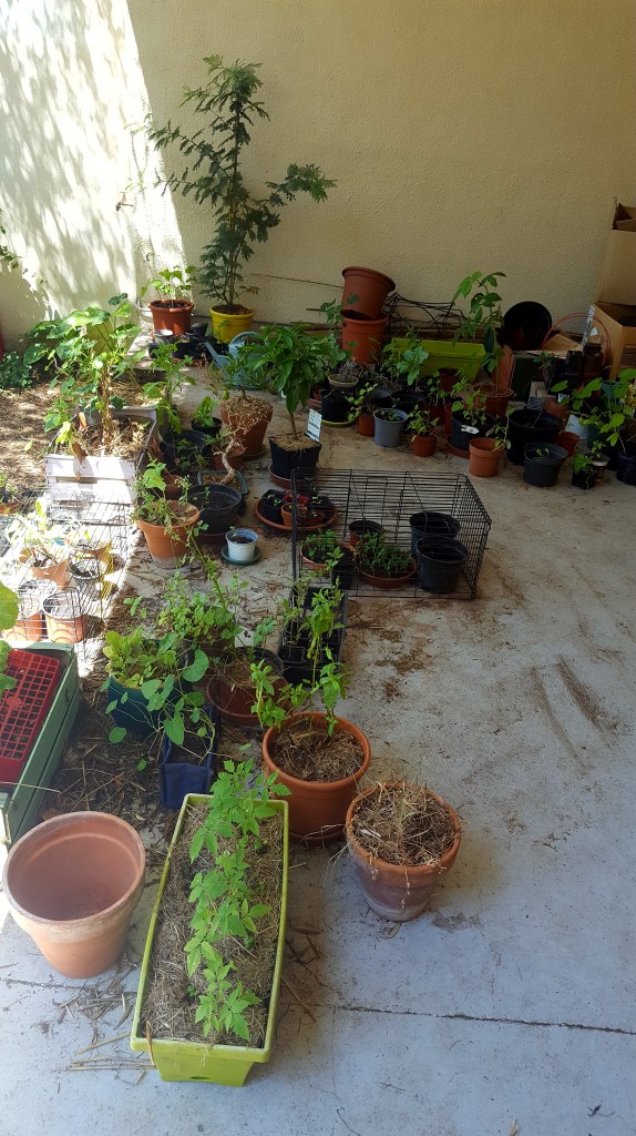 Vues les chouettes températures de mai (jusqu’à 33° quand même, mais où va-t-on ?) j’ai tout descendu sur la terrasse. Bon, ça nous encombre tout autant et comme je recommence des semis dès que j’ai planté quelque chose. On n’a pas l’impression que ça se désemplit !