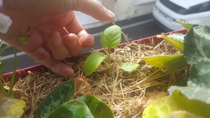 • Mes premières toutes petites aubergines (mais ça grandit jamais ça ?!) en jardinière. Oui mes jardinières d’hiver sont quelque peu déplumées.