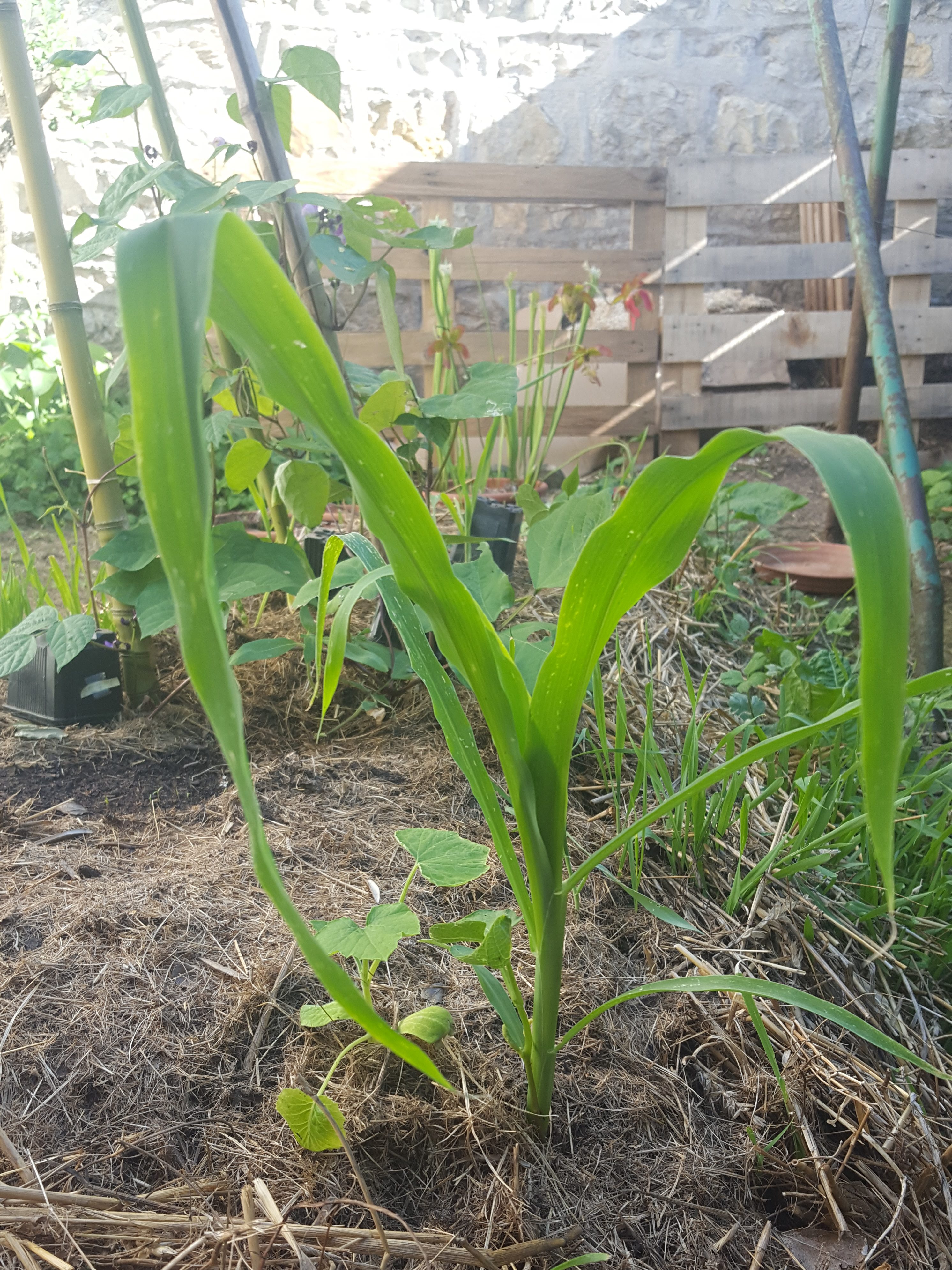 29 mai : tout à droite la courgette ronde de Nice. Et le haricot (on dirait qu’il part du pied du maïs)