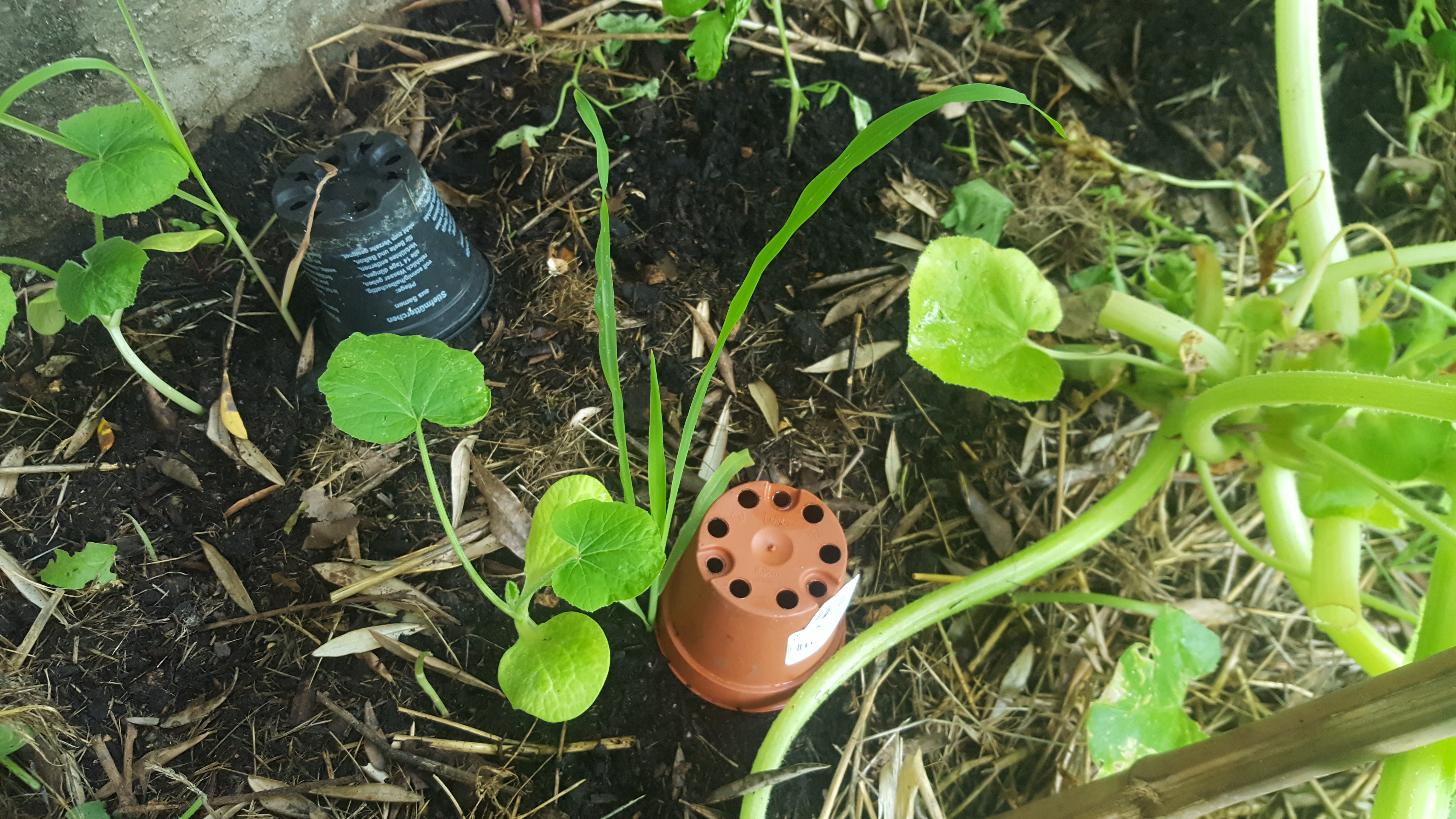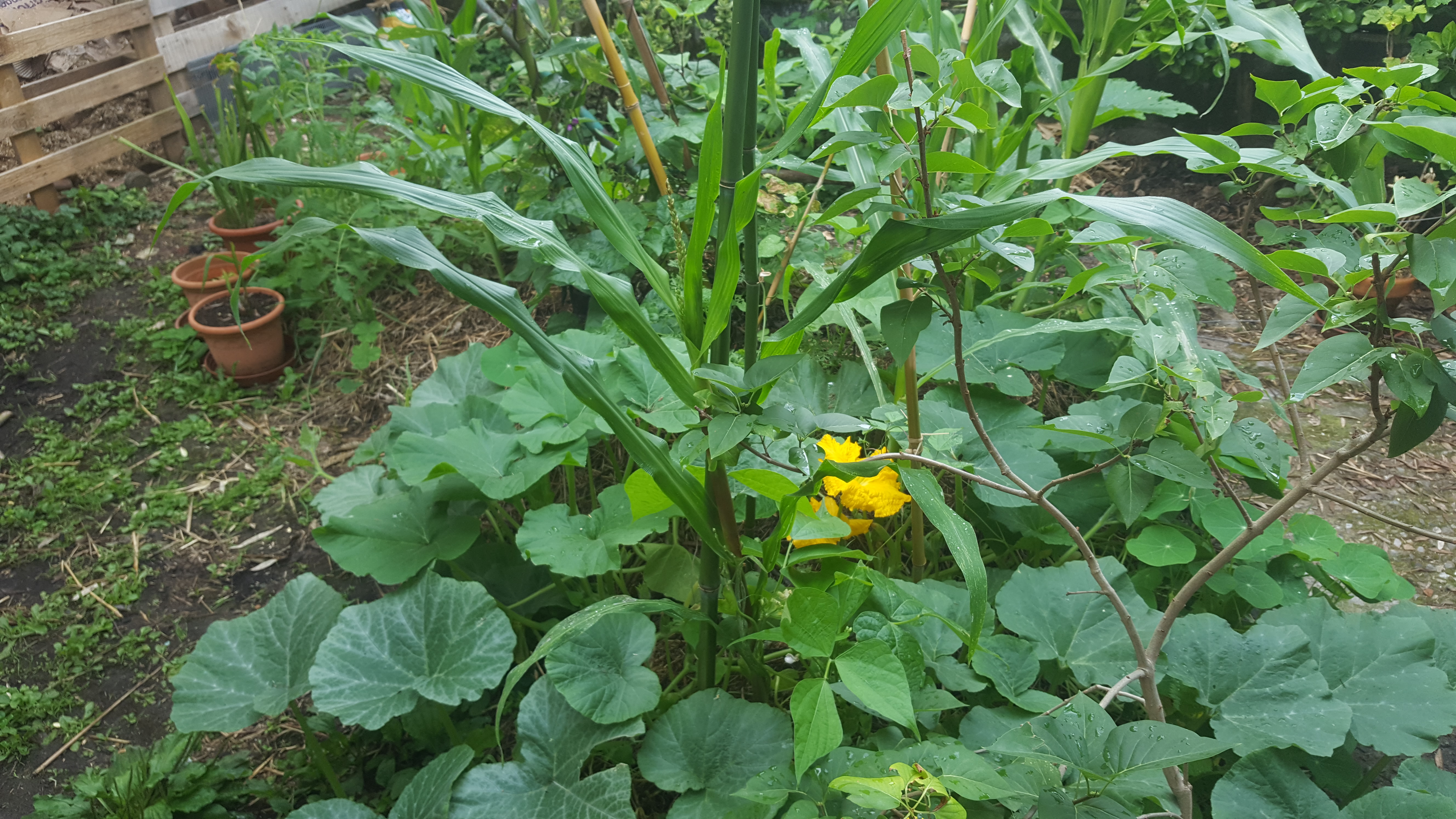 - Ne reste plus que la courge qui vient couvrir le sol, en garde la fraîcheur et empêche les adventices de pousser.