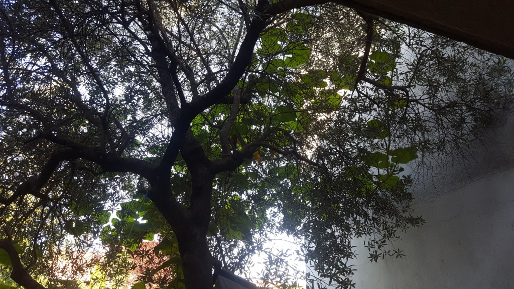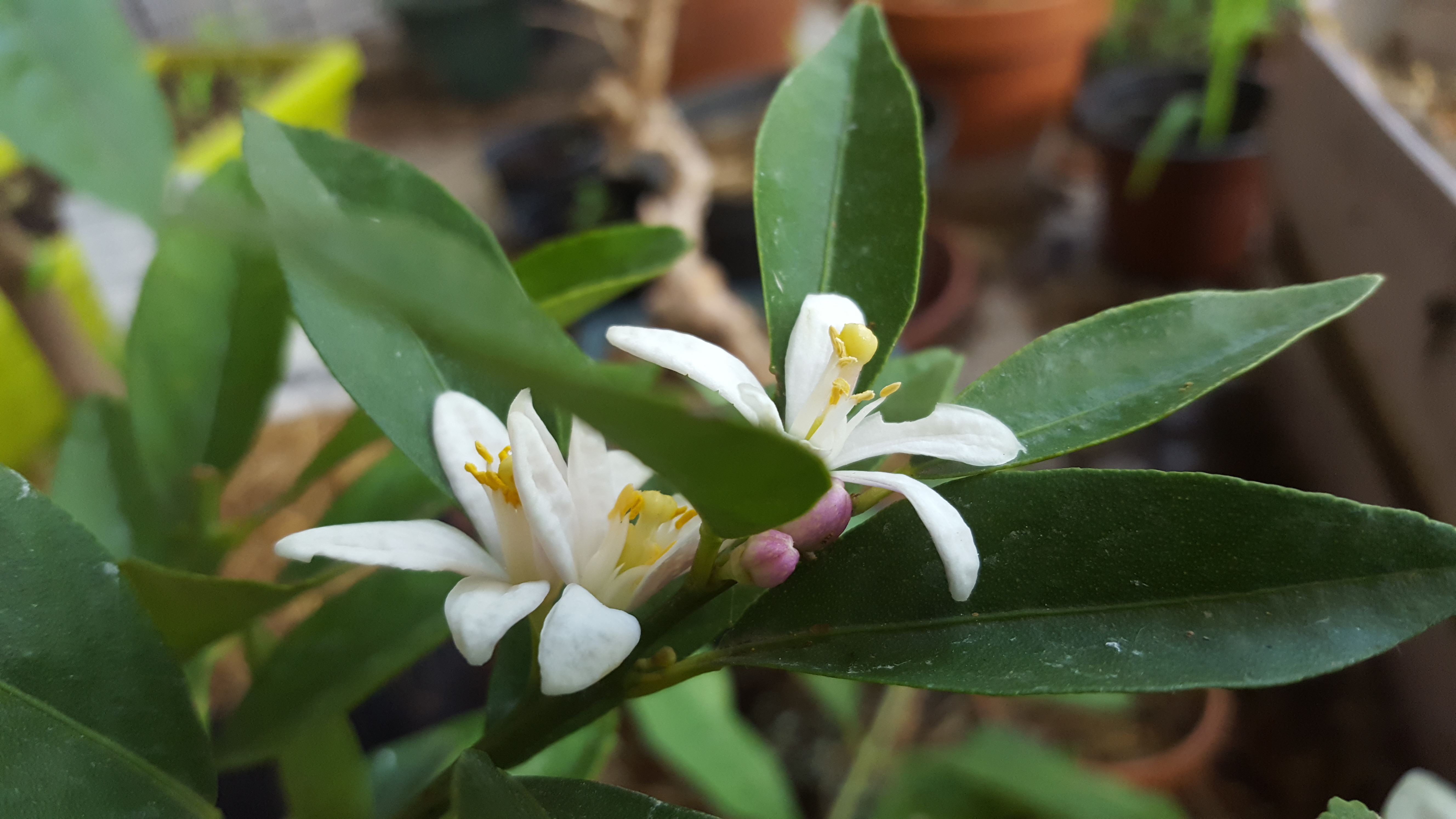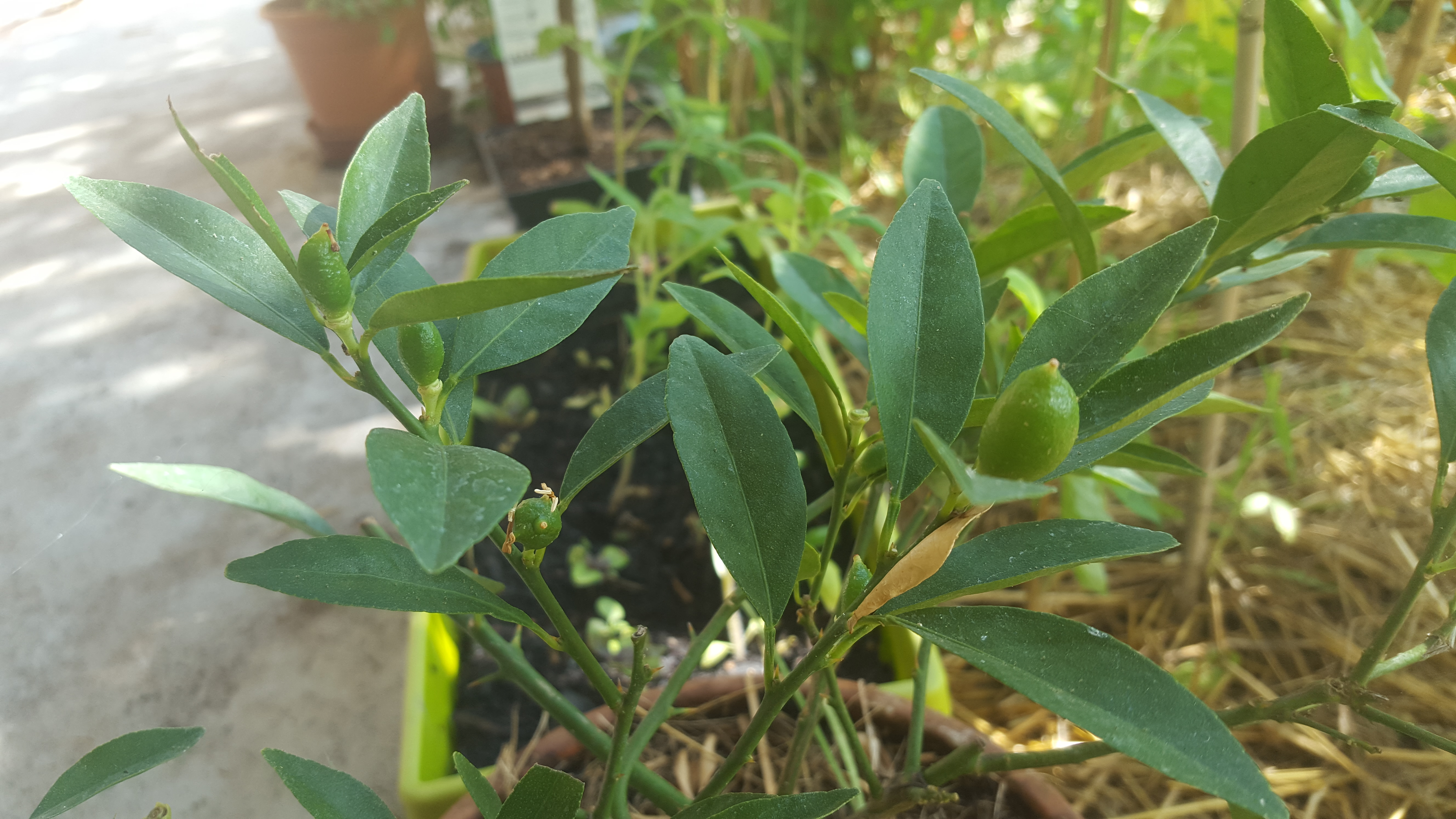 - Le citronnier est prometteur. Moult petits citrons dont un qui commence à jaunir (et c’est bon signe chez les citrons) mais j’ai le sentiment qu’il est là depuis mars !
