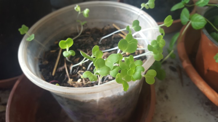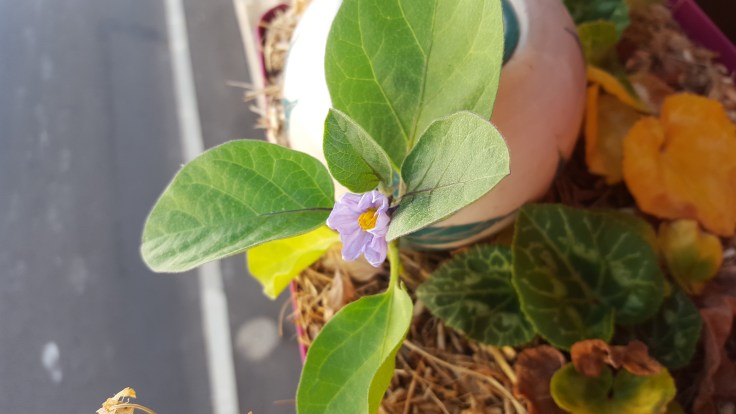 - Deux plants d’aubergine fleurissent (un qui fait la taille de mon index, j’ai de longs doigts mais je me demande comment il va la porter son aubergine – naine – mais tout de même !).