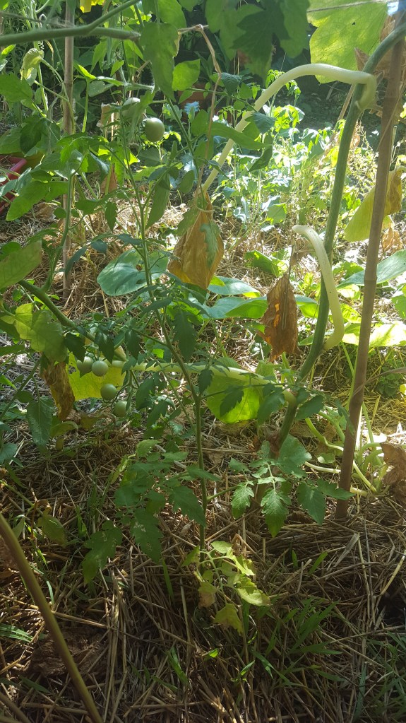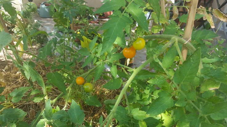 - Les tomates, star de l’été – très timides chez nous ! – commencent tout juste à donner (des cerises en plus… Pas de quoi faire une salade !) et nous sommes le 4 août.