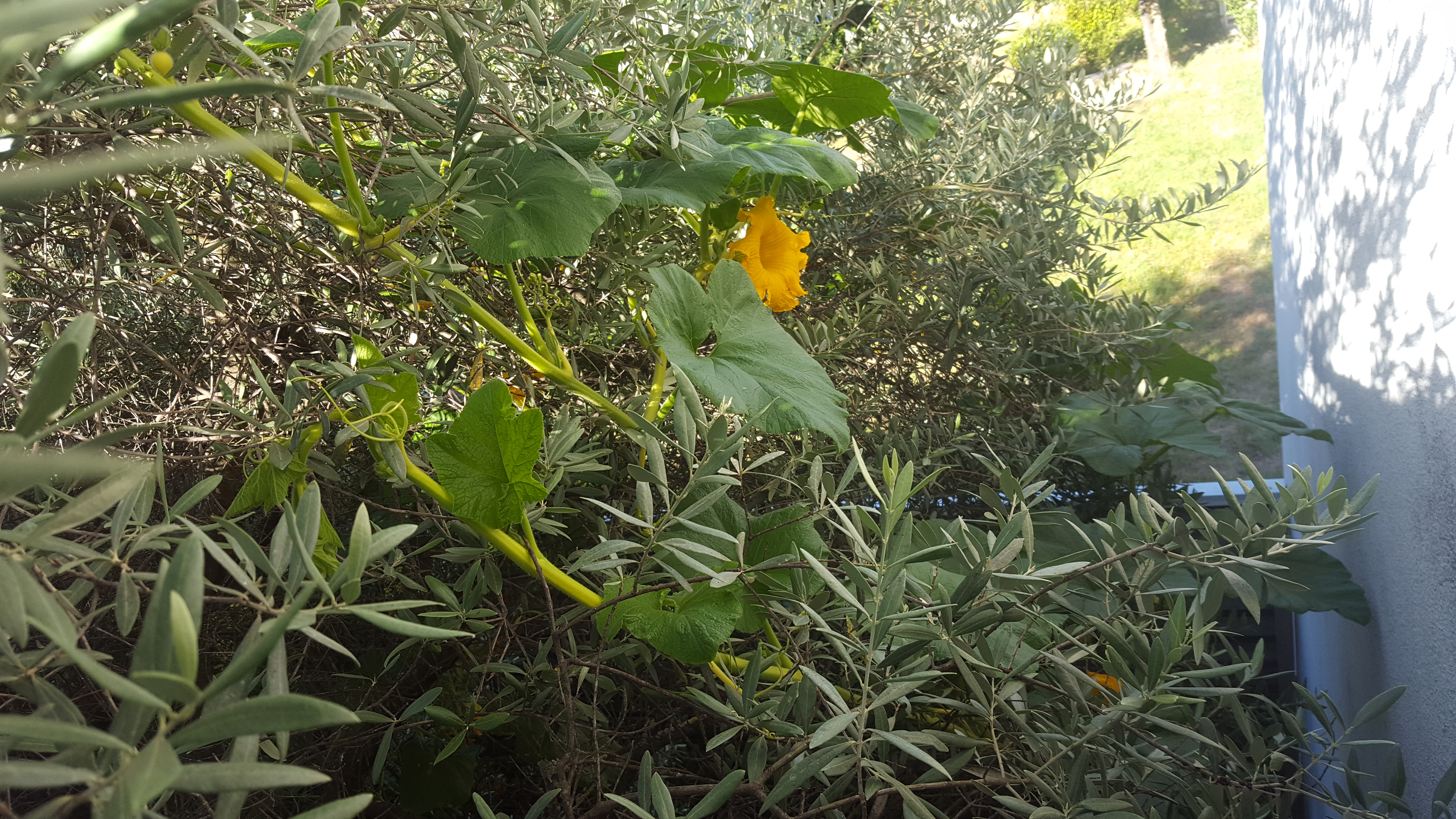 Oui, on a toujours de belles surprises au jardin, cette année ce sont mes semis spontanés de courge (des semis qui ont levé tout seul !), l’une va dans l’olivier jusqu’à le recouvrir presque totalement (ça le protège).