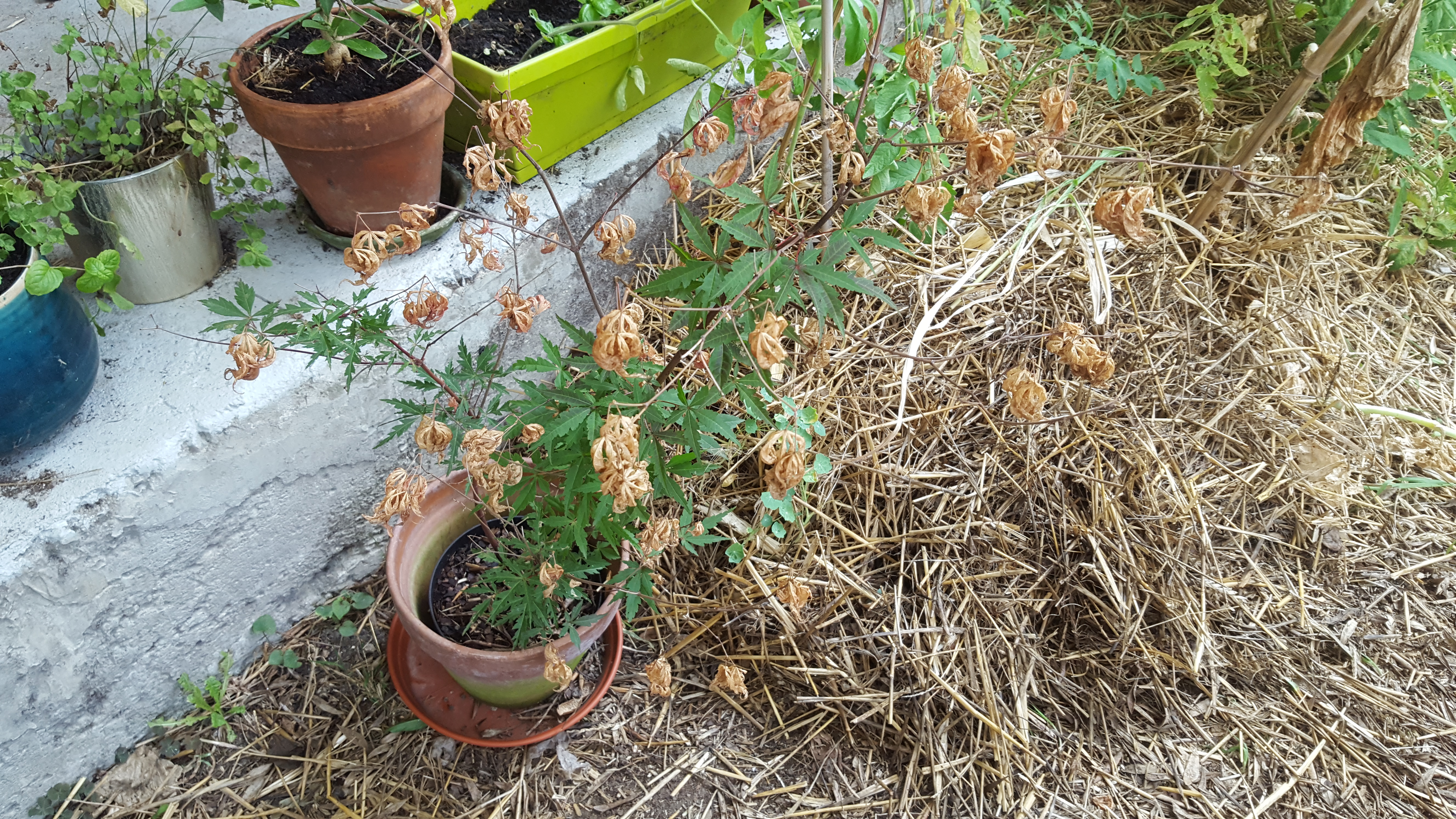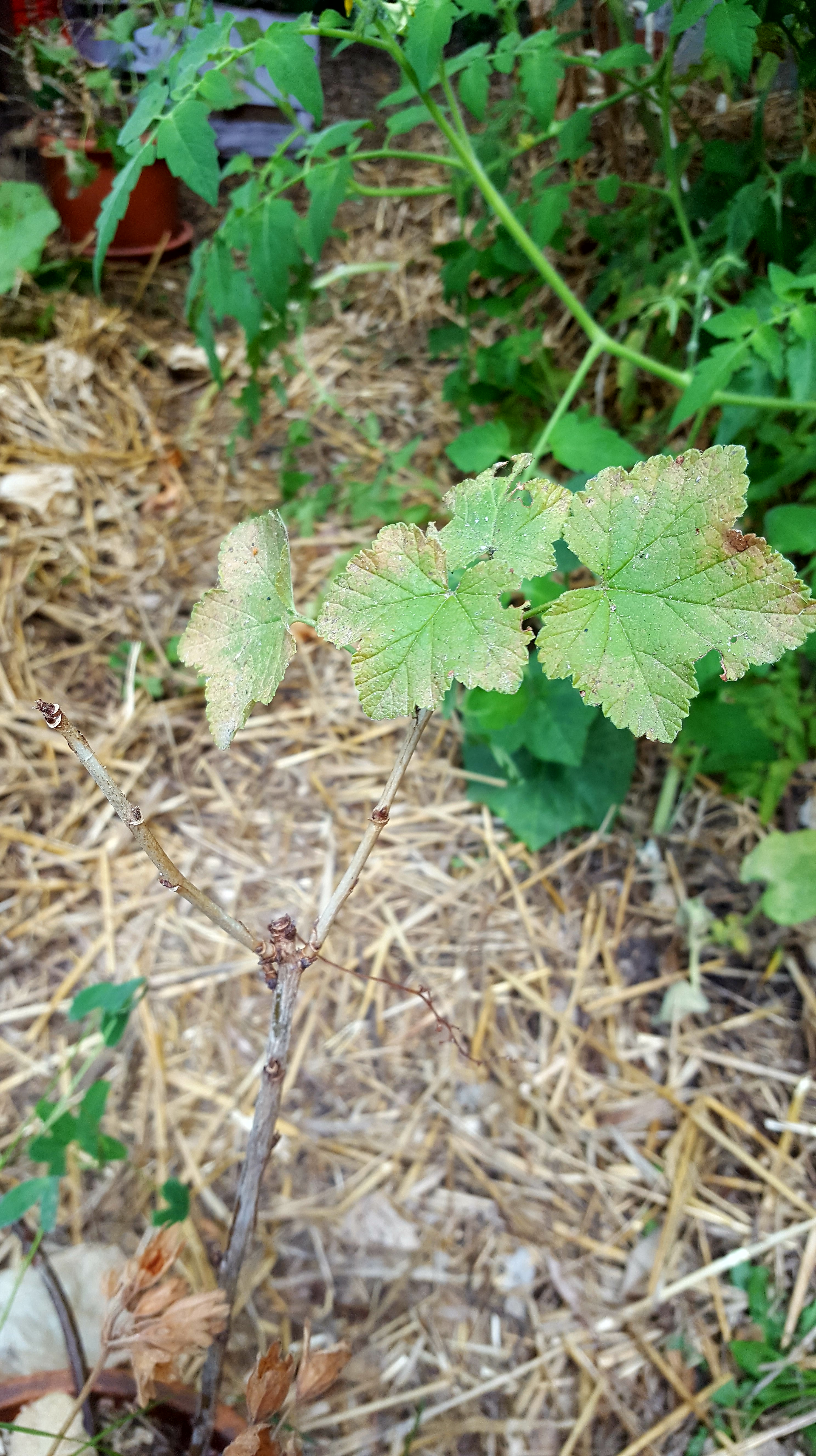 - Le groseiller. Victime d’un oubli d’arrosage. J’ai mis trop de pots un peu partout. Si des gens viennent arroser il faudra que je mette tous les pots au même endroit.