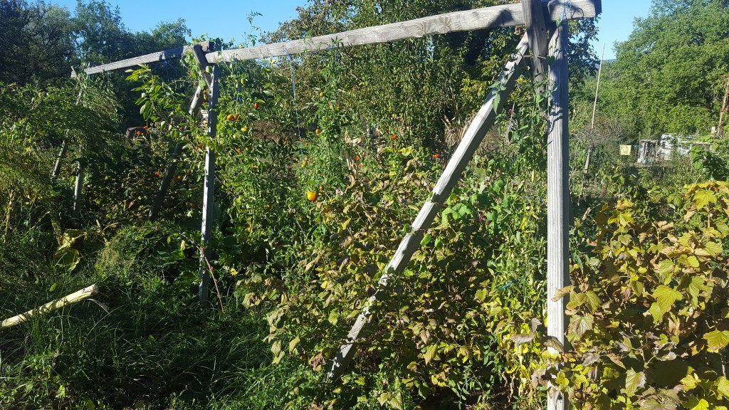 En marchant dans son jardin, je découvre des tomates cultivées en solitaire et des tomates cultivées parmi tant d’autres choses. Les premières ont les feuilles toutes recroquevillées et n’ont quasiment rien donné. Les autres profitent du couvert végétal des plantes autour et sont très productives. Un vrai microclimat sans pareil.