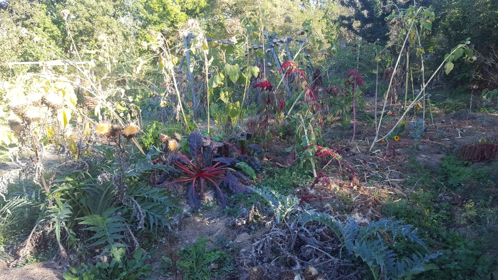 Enfin, bien sûr la majeure partie de ses cultures est dédiée à la production de légumes ! Toutes sortes de légumes avec comme producteurs de biomasse le tournesol, les amaranthes et les tithonias.