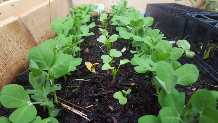 - dans la bande centrale semez deux rangs de petits pois (ci-contre des pois mangetout épargnés par nos amies les…!). À la volée, semez-y également des épinards de PRINTEMPS.