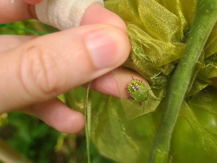 Je ne me suis pas posé de questions trop longtemps car il s’est avéré que les tomates piquetées et décolorées étaient régulièrement parcouru de quelques punaises. La punaise verte ponctuée (Nezara viridula) dont les juvéniles ressemblent (si on regarde vite fait) à des petites coccinelles avec leurs petits points.
