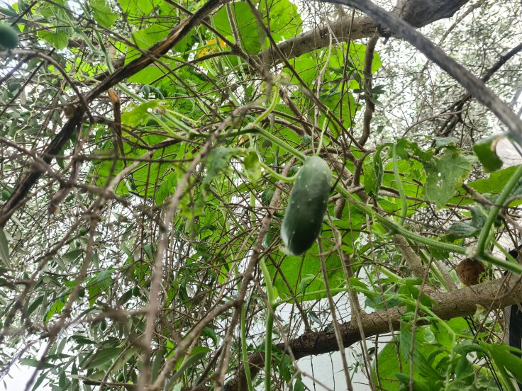 Les concombres arboricoles : pareil que son cousin le potimarron aérien, ce concombre relativise et demande une certaine souplesse (d’esprit) pour être récolté/compris.