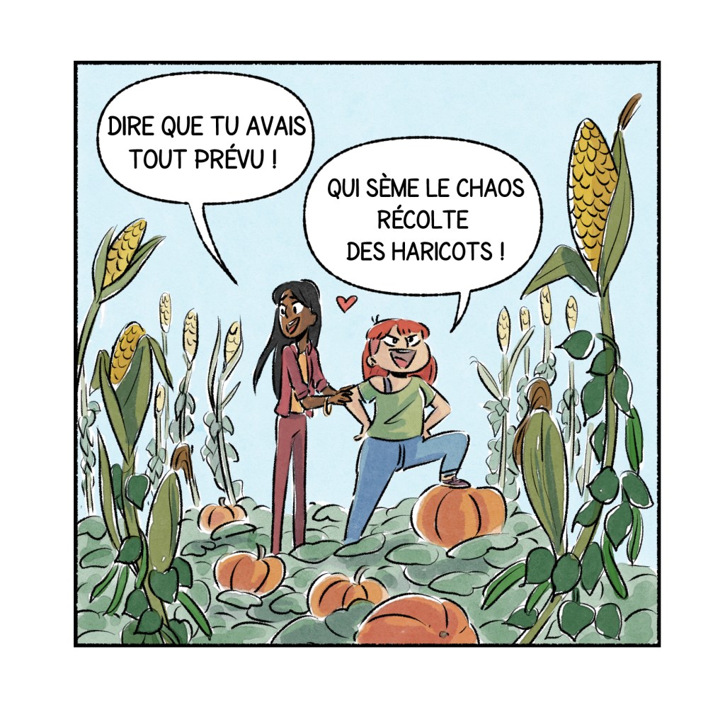 Nous commençons à y voir plus clair quant au choix des plantes effectué par Capucine. Satya aurait pu faire une recherche sur Internet et elle aurait trouvé que cette association s’appelle la Milpa ! Elle était utilisée par les Amérindiens pour pouvoir cultiver de manière productive l’essentiel de leur alimentation sur un même espace : du maïs, des haricots rouges et des courges. Ce n’est pourtant que bien plus tard qu’on découvrira que le haricot agit comme un engrais sur les deux autres plantes mais les Amérindiens devaient en avoir l’intuition !