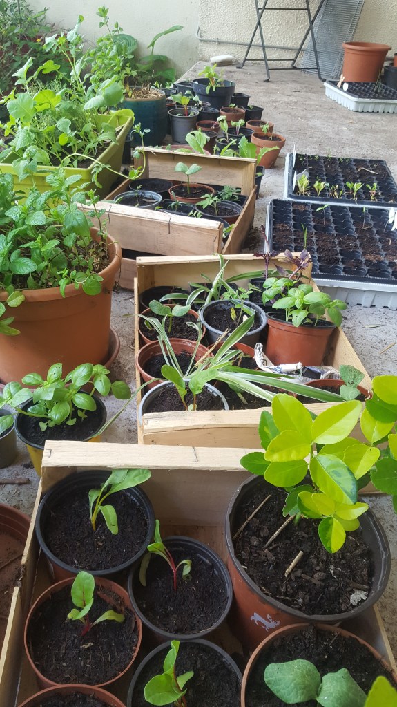 - en mai il y a déjà beaucoup de choses à faire au jardin, ça nous laisse du temps de libre pour le reste (ci-contre une bonne partie de mes semis qui attendent d’être mis en pleine terre) ;