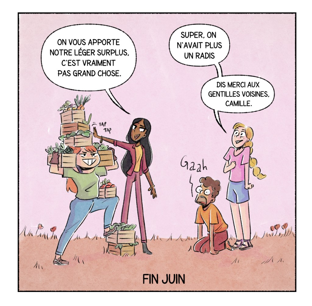 Et comme on finit toujours par récolter ce qu’on sème, voilà Capucine et Satya avec de gargantuesques récoltes, résultat de tout leur investissement au potager. Comme elles ont porté une attention particulière à chaque espace cultivé et qu’elles ont fait des lasagnes, c’est bien le quadruple de récolte qui les attend.