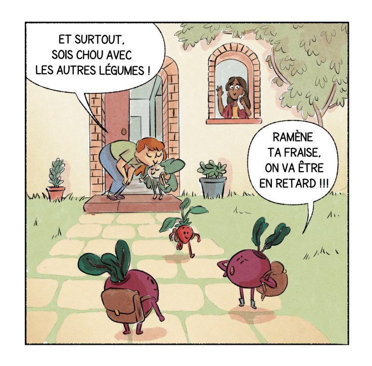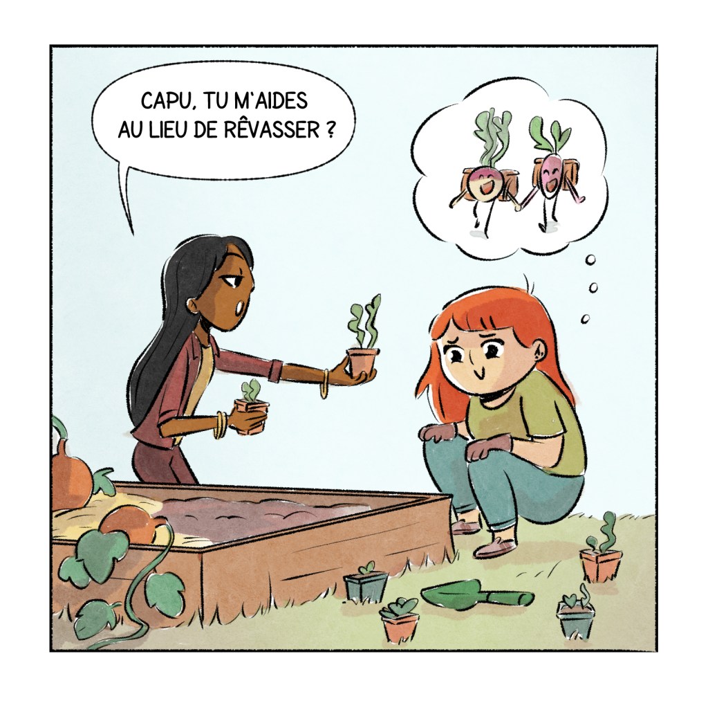 C’est exactement ce que fait Capucine en imaginant ces petits légumes encore à l’état de graines devenir jeunes pour s’implanter à l’école du potager.