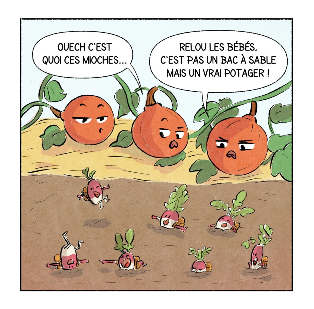 - les radis vont rencontrer les potimarrons qui considèrent le potager comme leur territoire (vous avez vu la place qu’ils prennent !).