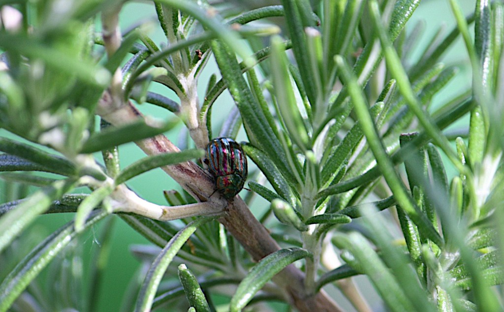 C’est un robuste, toutefois il redoute la chrysomèle américaine (qu’on appelle désormais la chrysomèle du romarin), de son petit nom Chrysolina americana. Il s’agit d’un petit coléoptère qui s’attaque aux plantes aromatiques en s’en nourrissant, tout simplement. Notre poussin est malheureusement trop petit pour les atteindre et surtout trop défoncé pour s’en préoccuper. Donc si vous constatez que nombre de vos feuilles sont broutées et que vous craignez pour l’avenir de votre romarin, ramassez les individus à la main, surtout avant la fin de l’été (avant la période de reproduction) sinon vous vous retrouverez avec une nouvelle génération l’année prochaine.