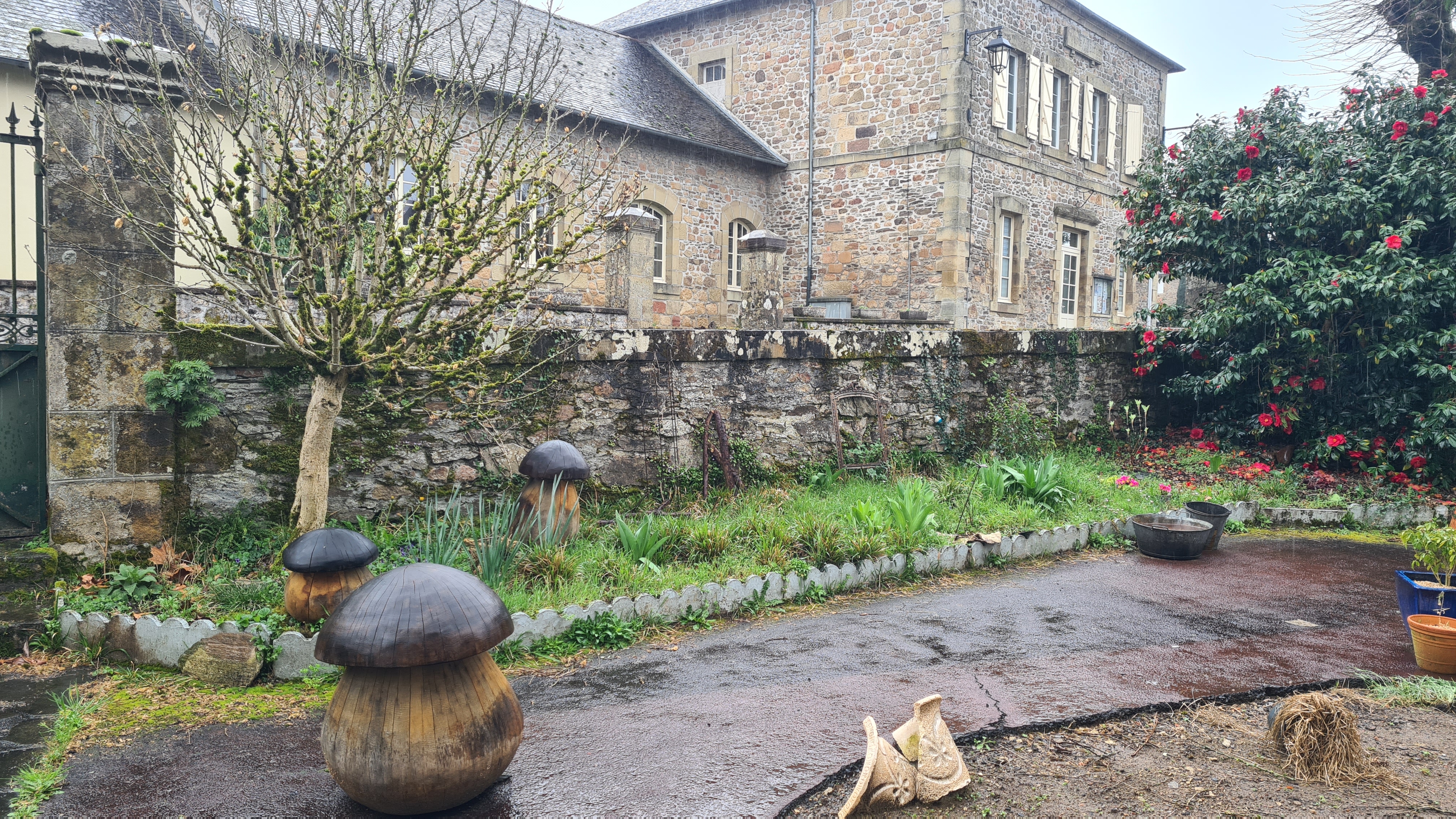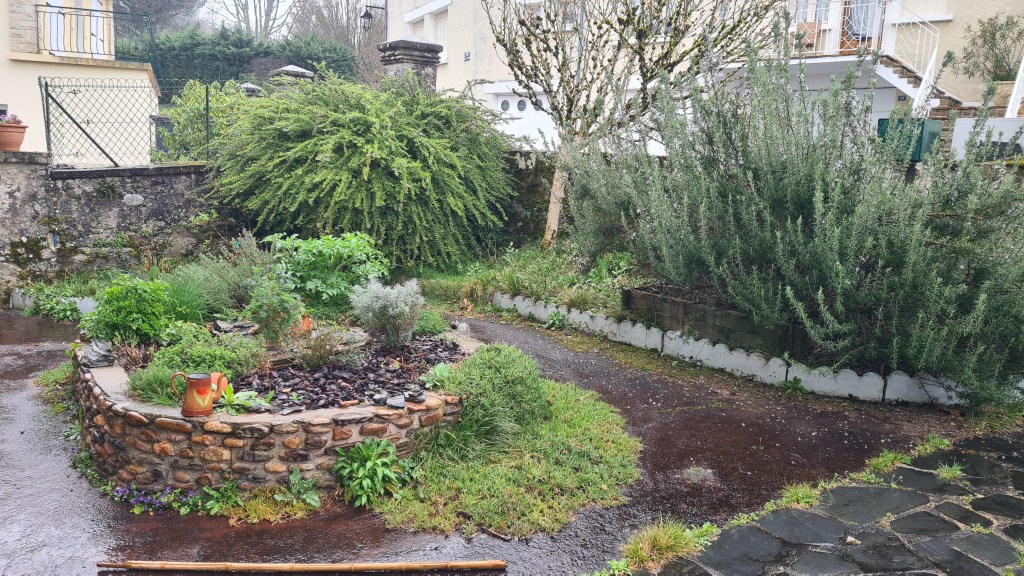 - Quelques essais de plantations qu’on ne voit pas sur la photo, comme des heuchères, des bulbes (tulipes) et qu’il faudra intégrer à l’ensemble final