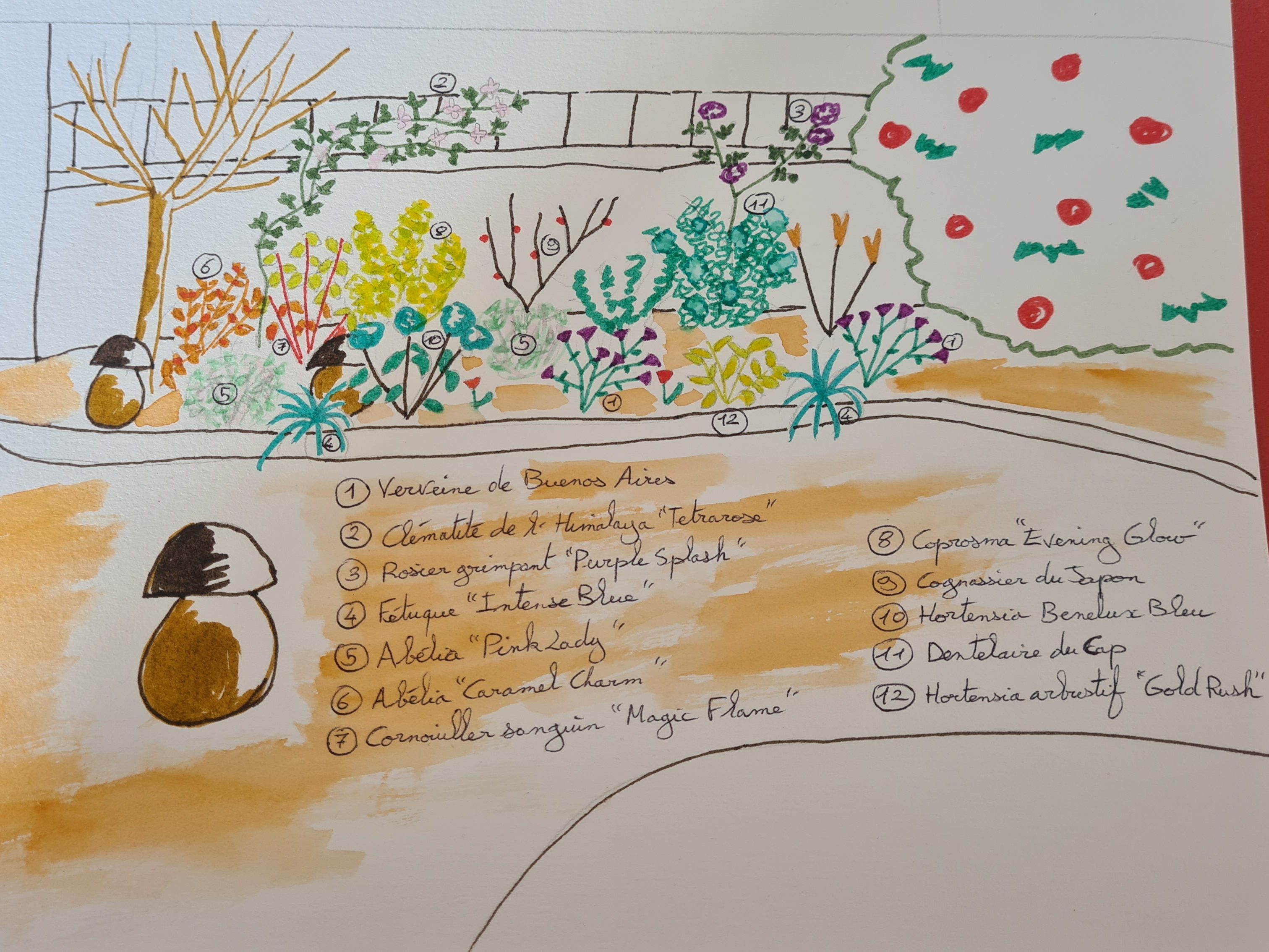 - Pour les strates : j’ai pensé à deux grimpantes, la clématite de l’Himalaya « Tetrarose » (2) et le rosier grimpant « Purple Splash » (3). Ces deux grimpantes présentent une croissance rapide (un avantage pour partir rapidement à l’assaut de la future grille) et perdent leurs feuilles en hiver ce qui permettra à ma coachée de profiter de son jardin sans être vue depuis la rue. De plus, elles démarrent toutes deux leur floraison au printemps (de quoi nous avertir du changement saisonnier) et le rosier fleurit sur environ 6 mois ! Dans le massif j’ai mis les arbustes qui dépassent les 1 mètres de hauteur dans le fond (c’est le cas du Coprosma « Evening Glow » (8) qui offre en plus un beau feuillage lumineux) et les plus petits devant comme l’abélia « Pink Lady » (5) qui ne va pas dépasser les 50 cm.